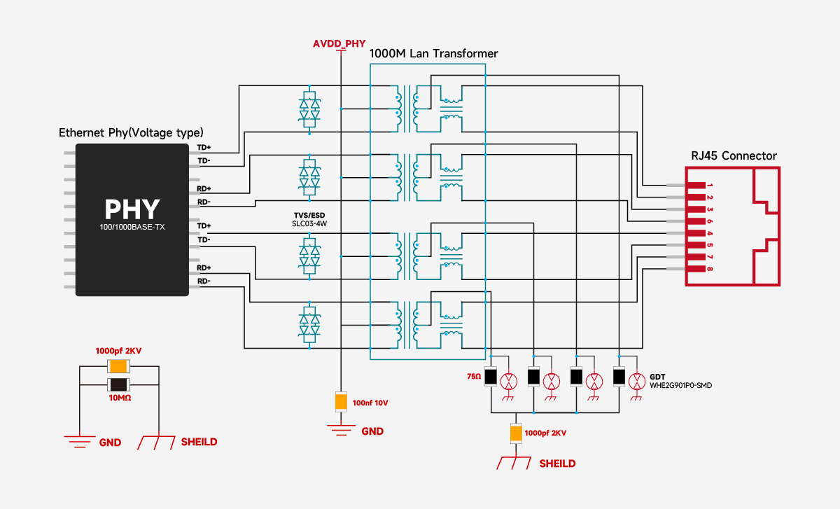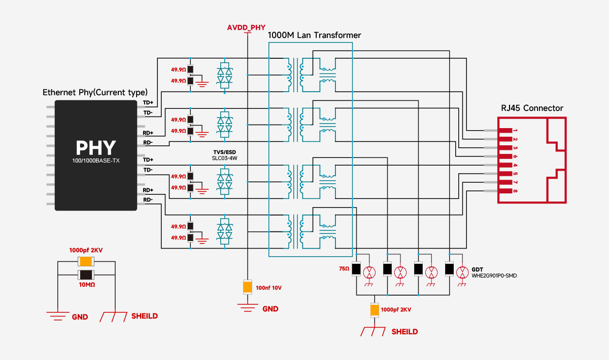 • VCC Power Supply: For current-mode PHYs, the primary coil needs to be connected to the PHY's VCC to filter high-frequency noise and ensure signal stability. It is recommended to connect two 49.9Ω resistors in parallel between each differential pair and connect them to GND.