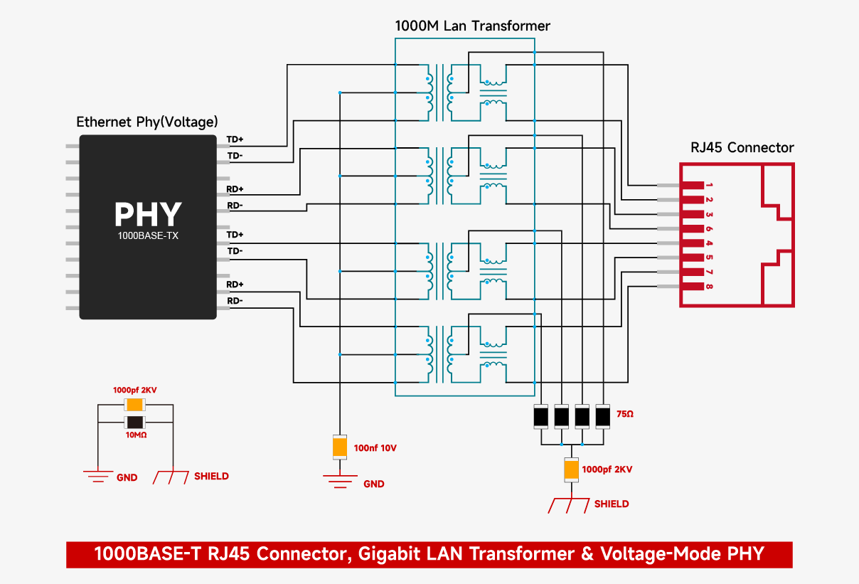 For voltage-mode PHY, pay attention to the center‑tap capacitor value – 0.1μF is typical; for Gigabit, a slightly larger value may reduce jitter.
