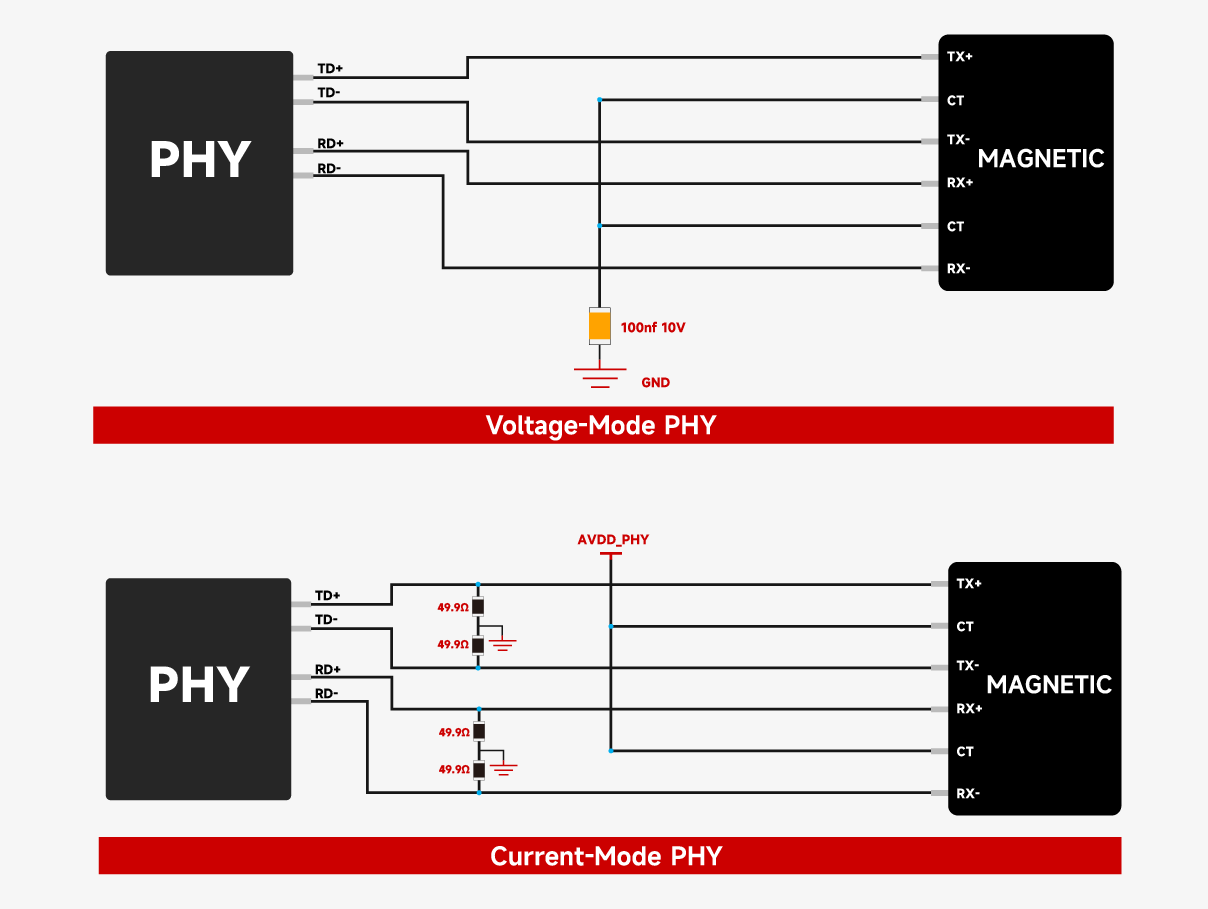 The driver type of an Ethernet PHY chip directly determines system signal integrity, anti-interference capability, and hardware design complexity. Voltage-mode and current-mode PHYs may appear to differ only in signal carrier, but they have fundamental differences in internal architecture, biasing mechanism, and peripheral circuitry. Selecting the wrong type will lead to link failure or performance degradation.