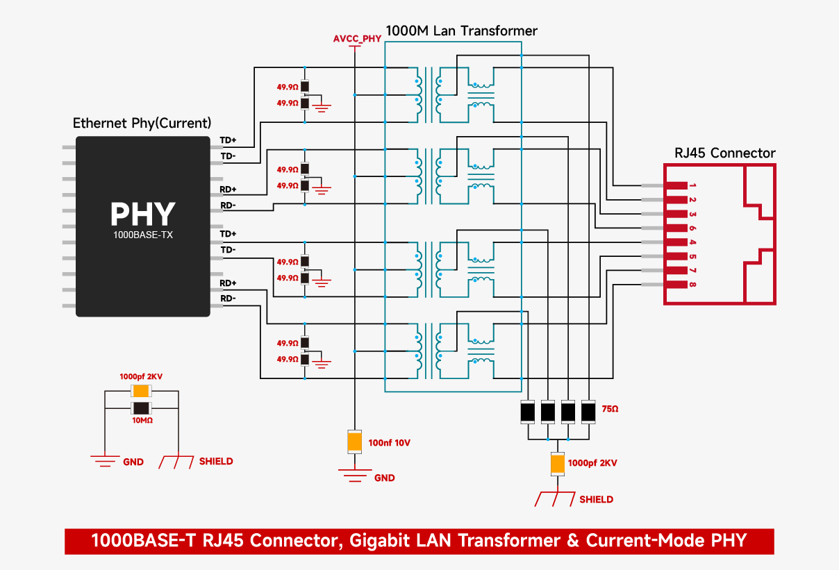 For a current-mode PHY, the bias voltage is applied through the center tap of the Lan Transformer to provide a stable DC operating point for the internal current driver, ensuring symmetrical swing of the differential current signal and a full signal swing. If the bias is missing or incorrectly connected, the current cannot form an effective loop, the signal amplitude is severely attenuated, and the link cannot be established.