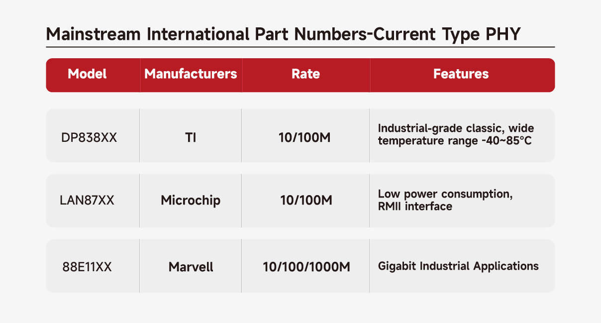Current‑mode PHYs are widely used in industrial Ethernet interfaces due to their strong drive capability and stable anti‑interference performance.Texas Instruments (TI) DP838xx series – a classic in 10/100M, supports -40~85°C wide temperature, proven in industrial controls such as PLCs and drives.Microchip LAN87xx series – also 10/100M, low power, RMII interface simplifies design, suitable for power‑sensitive embedded devices.For Gigabit, Marvell 88E11xx series provides a reliable Gigabit industrial solution, performing well in switches and industrial cameras.