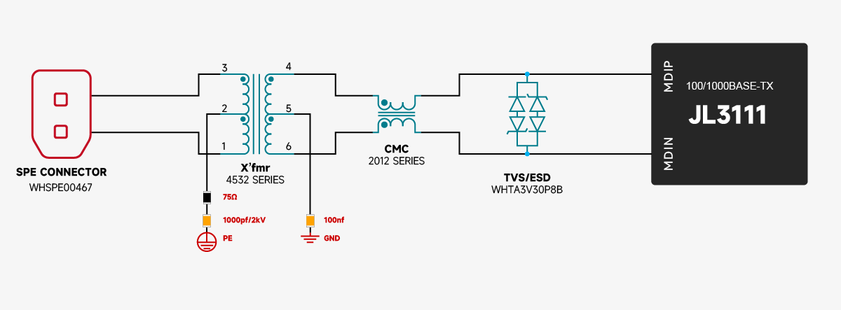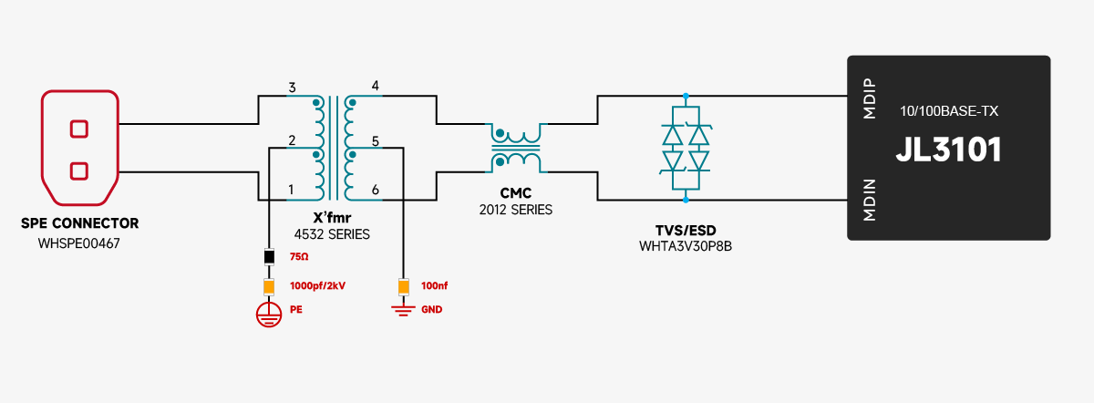 This solution is developed based on Jinglue Semiconductor’s JL310x (100M) and JL311x (1000M) series. With 3.3V or 1.8V TVS protection, common‑mode suppression realized by a 2012‑package CMC, and then signal isolation and impedance matching via a 4532 x’fmr (transformer), communication can be established externally through VOOHU’s SPE connector.