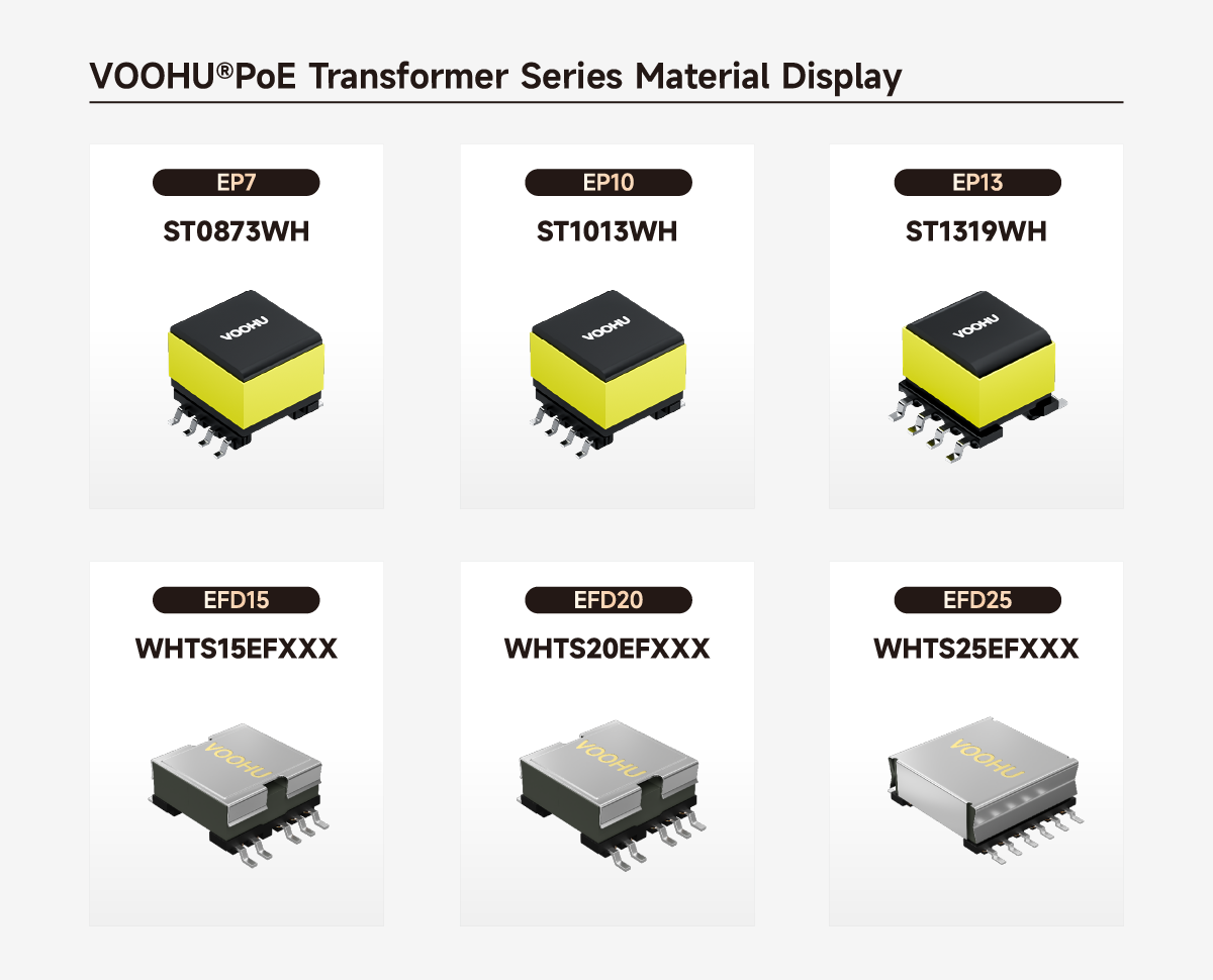 To meet PoE power delivery requirements, VOOHU recommends the following models: ST0873WH (EP7, 10W/12V), ST1013WH (EP10, 10W/13.5V), ST1319WH (EP13, 13W/5V), WHTS15EFXXX (EFD15 series, 10W/3.3V), WHTS20EFXXX (EFD20 series, 100W/12V), and WHTS25EFXXX (EFD25 series, customizable). This series covers a power range of 5W to 100W, supports output voltages such as 12V, 5V, and 3.3V, and is suitable for PoE switches, powered devices (IPCs, APs, VoIP), and industrial IoT gateways.
