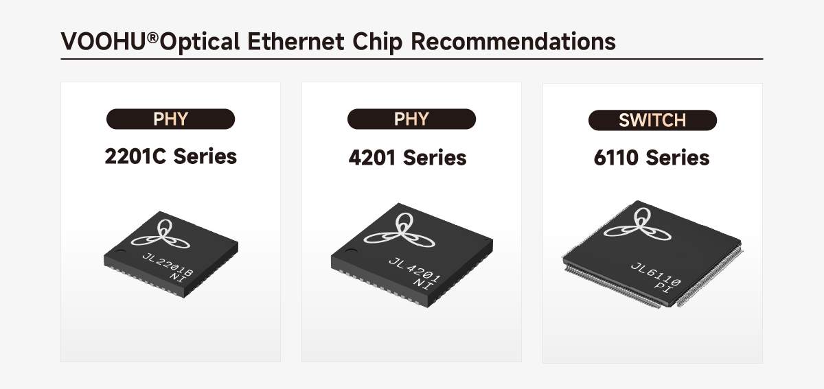 For optical Ethernet applications, JLSemi recommends the following PHY/switching chips: 2201C Series (Gigabit PHY, supports SGMII, configurable to 1000BASE-X optical mode), 4201 Series (2.5G PHY, supports 2500BASE-X optical, suitable for PON and industrial optical communication), and 6110 Series (Gigabit switching chip, 8+2 ports, supports SGMII/H-SGMII uplink, can connect to external optical modules). When combined with VOOHU SFP Connectors and Lan Transformers, these chips enable rapid optical Ethernet design.