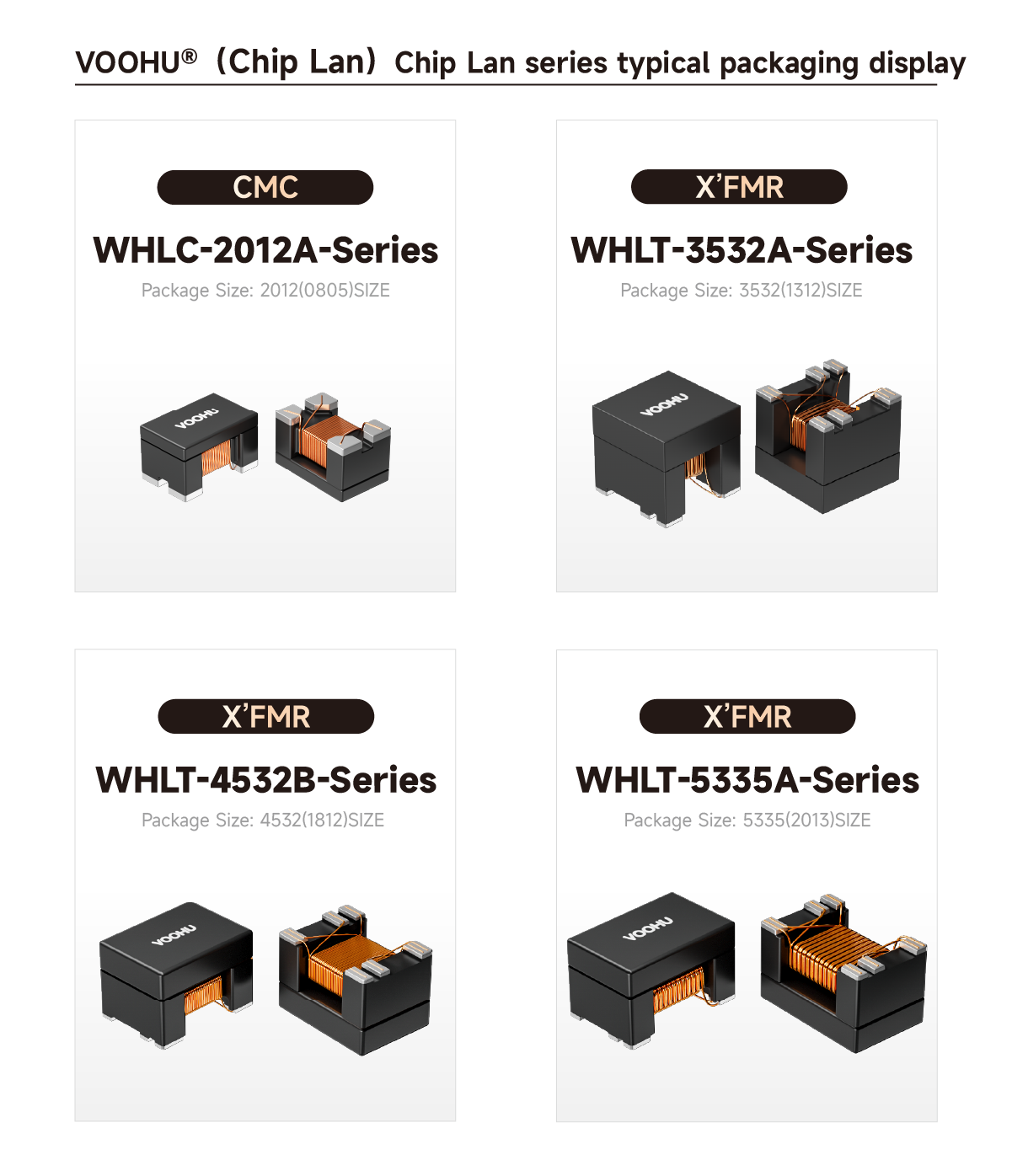 The new chip-type Lan Transformers adopt compact surface-mount packages. Typical series include WHLC-2012A-Series (common-mode choke), WHLT-4532B-Series, WHLT-3532A-Series, and WHLT-5335A-Series. The WHLC series integrates a CMC, while the WHLT series integrates a transformer + CMC, supporting speeds from 100M to 10G. They are suitable for space-constrained high-speed Ethernet interfaces such as IPCs, industrial cameras, embedded network cards, and more.