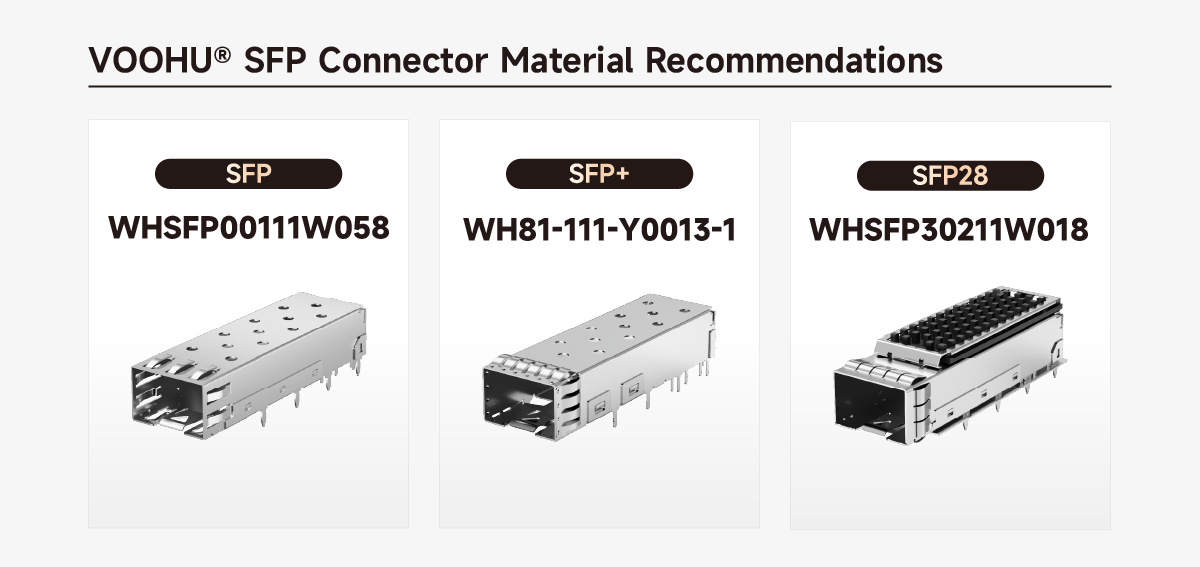 For equipment requiring optical module interfaces, VOOHU recommends the following SFP Connector models: WHSFP00111W058 (SFP cage, 1×1, press-fit, with ventilation holes), WH81-111-Y0013-1 (SFP+ cage, 1×1, solder type, no LEDs), and WHSFP30211W018 (SFP28 cage, 1×1, press-fit, with heat sink). These products cover rates from 1G to 25G, support press-fit or solder mounting, are compatible with standard SFP/SFP+/SFP28 optical modules, and are suitable for applications such as switches, fiber optic transceivers, and data center network cards.