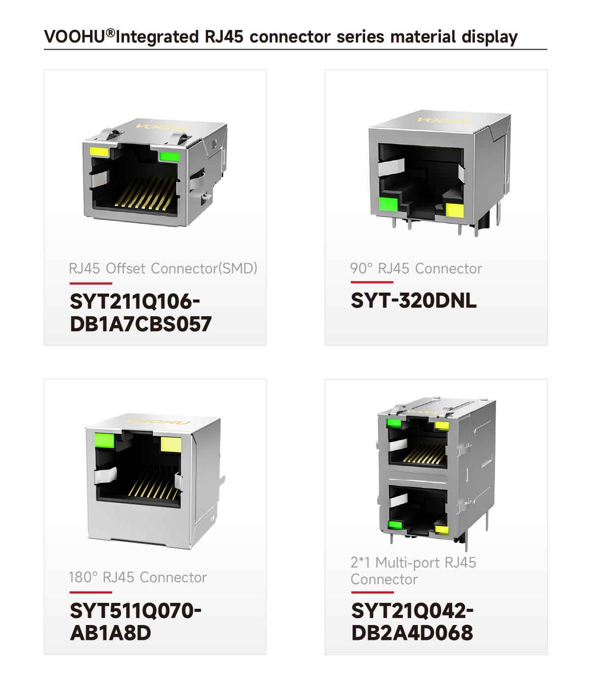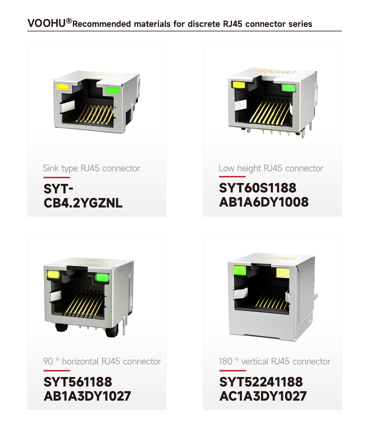 VOOHU offers several non-integrated RJ45 Connectors, including models SYT-CB4.2YGZNL, SYT561188AB1A3DY1027, SYT52241188AC1A3DY1027, and SYT60S1188AB1A6DY1008. This series does not contain built-in transformers; external Lan Transformers are required. Suitable for applications with existing mature transformer solutions or where flexible PHY matching is needed. Available in recessed-type, 90° DIP mounting styles, with optional LED indicators and shielded housings.