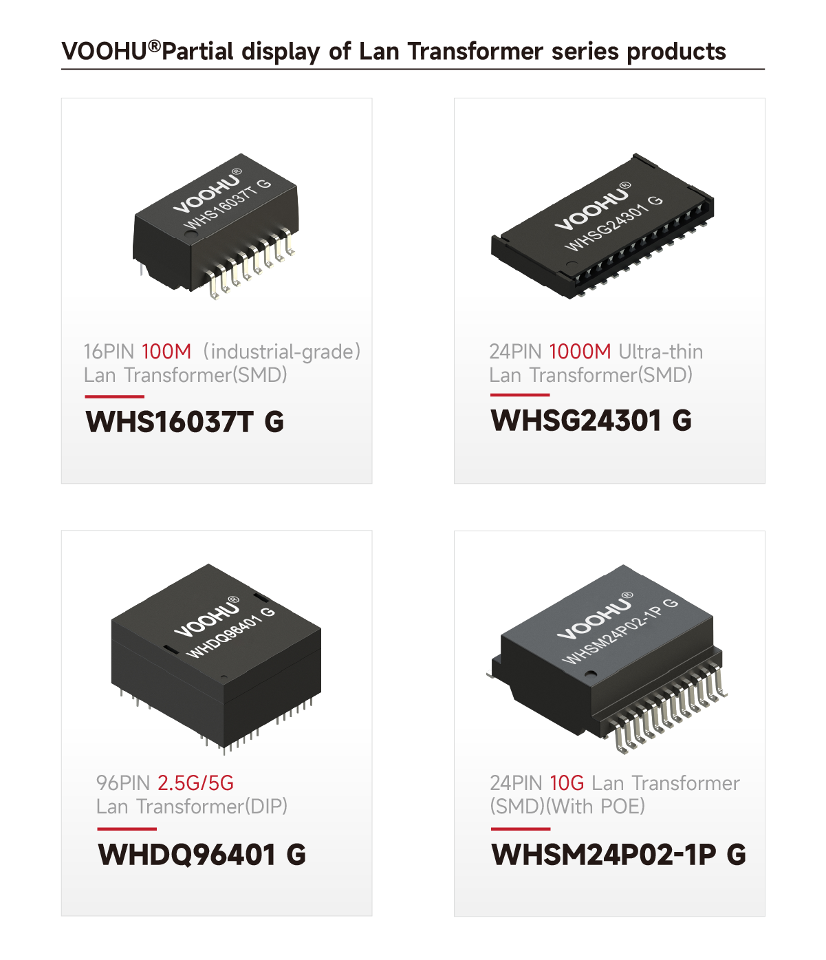 VOOHU Lan Transformers cover 100M to Gigabit rates, with typical models including WHS16037T G, WHDQ96401 G, WHSG24301 G, and WHSM24P02-1P G. The products support DIP/SMD packaging, with isolation withstand voltage of 1500Vrms. Some models are PoE-compatible. They are suitable for Ethernet physical layer isolation and matching circuits in switches, network cards, industrial control, and other applications.