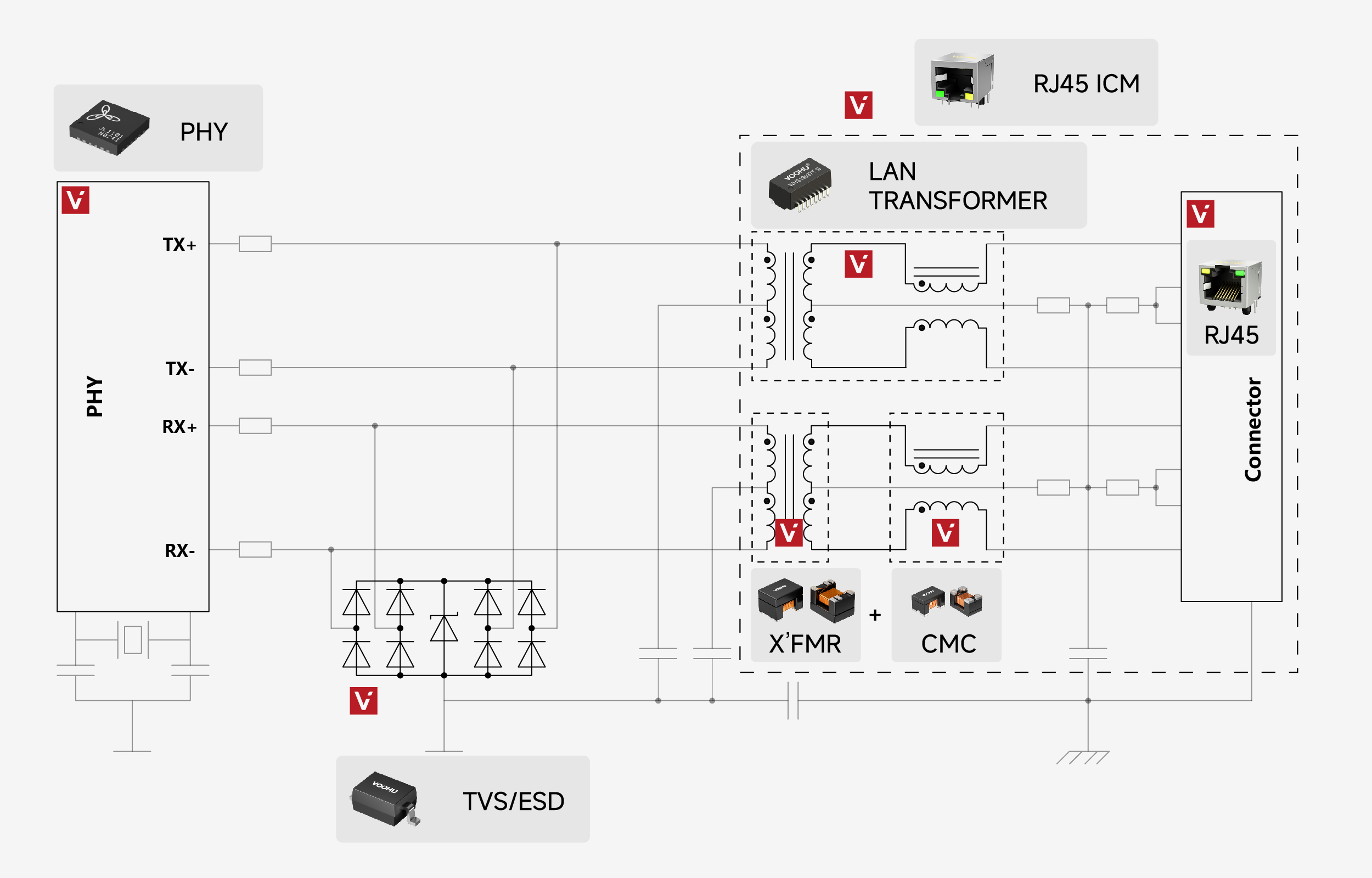 VOOHU Electronics (VOOHU) addresses these scenarios with products including Lan Transformers, common-mode chokes, RJ45/SFP Connectors, TVS/ESD/GDT protection devices, complemented by JLSemi PHY and switching chips, covering the complete link from signal isolation and common-mode rejection to interface protection.