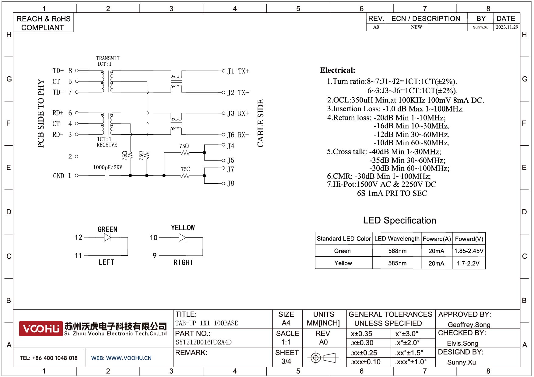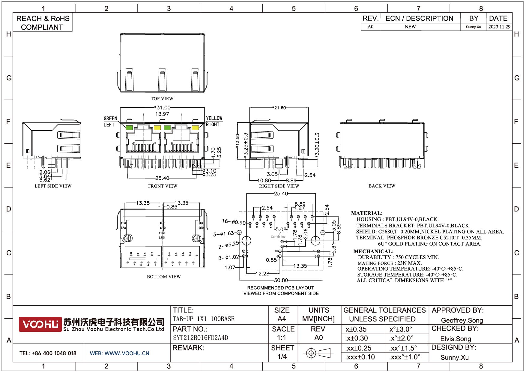 SYT114Q070AB2A1D 90° side insertion 1*4 Tab Down 100/1000M LED G/Y DIP RJ45