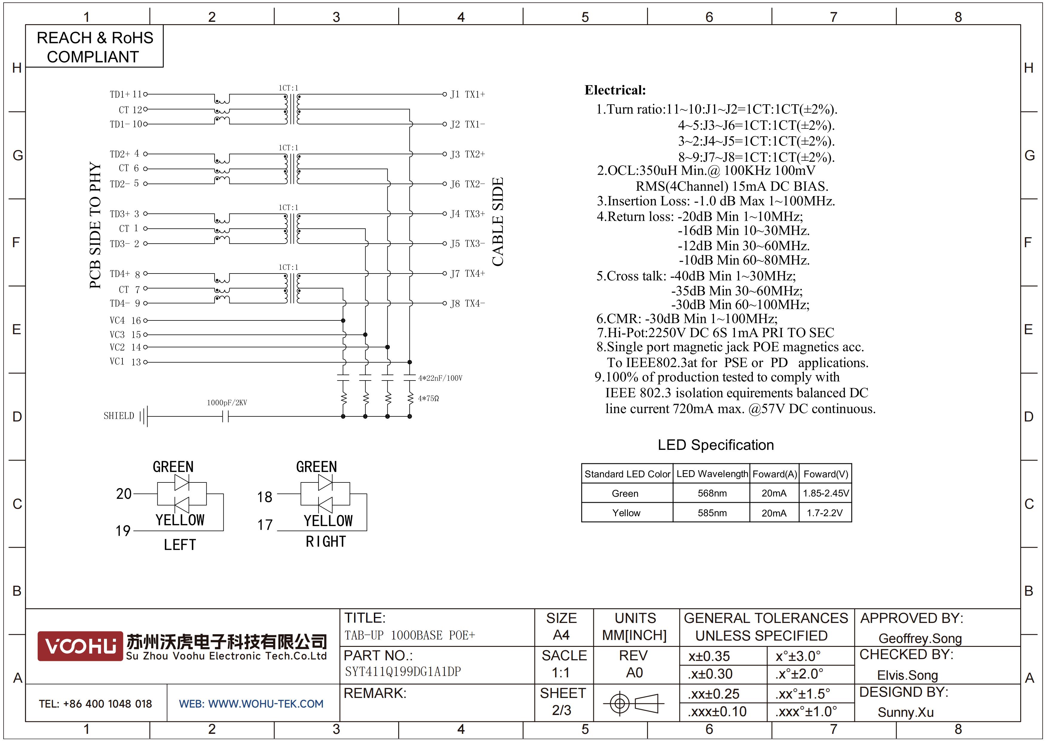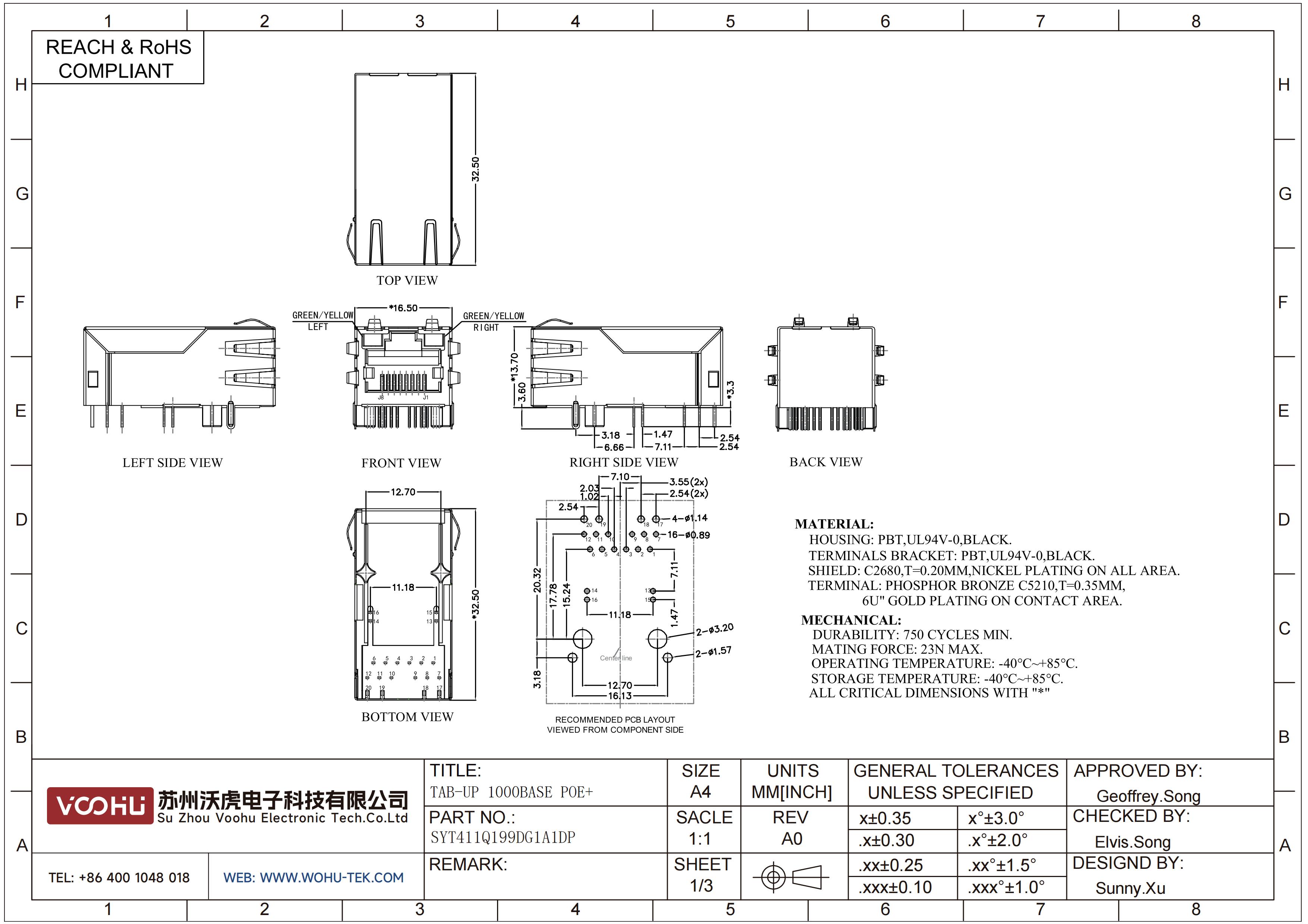 SYT411Q199DG1A1DP 90° side insertion 1*1 Tab UP 100/1000M POE 720mA LED GY/GY DIP RJ45