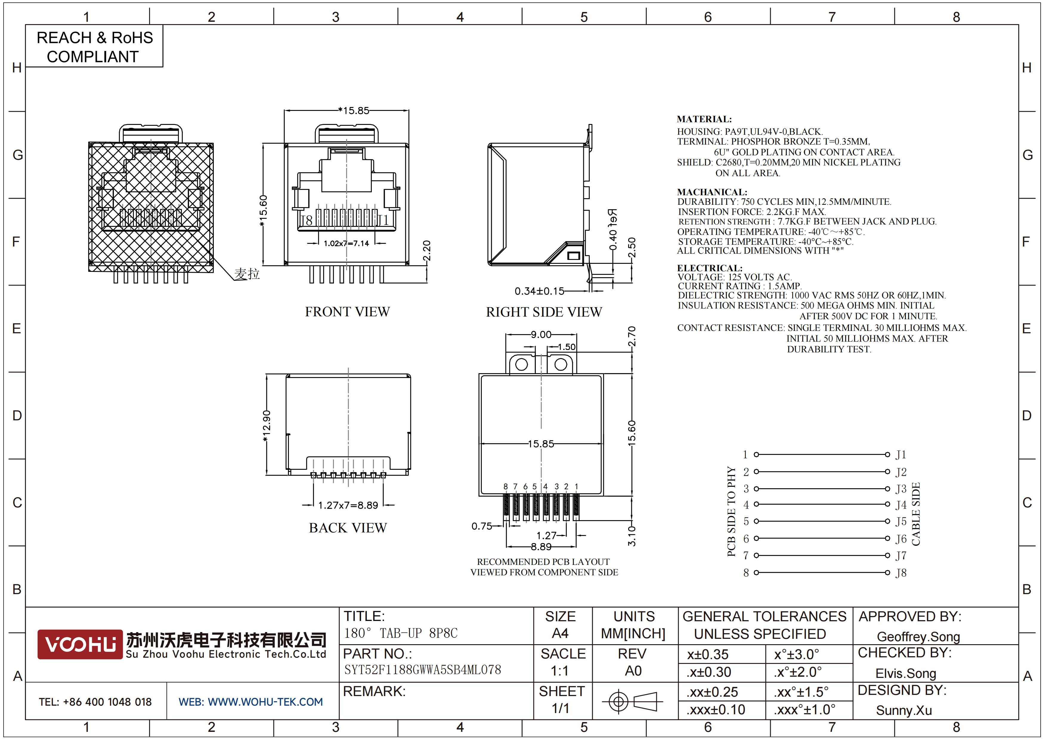 SYT52F1188GWWA5SB4ML078 180° 1*1 Tab UP NO LED SMD RJ45