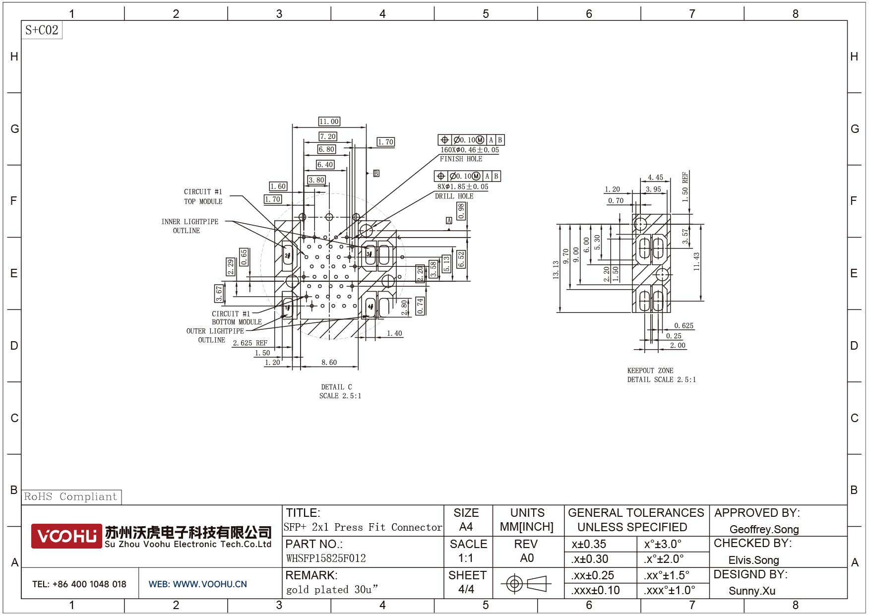 WHSFP15825F012 SFP+ 2×5 10G Press-Fit Cage+Connector Connector Gold Plated30U Fiber Optic cages