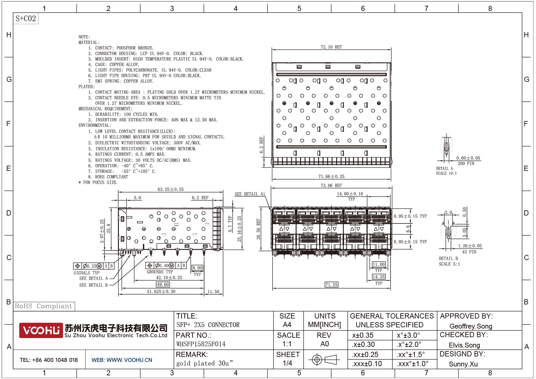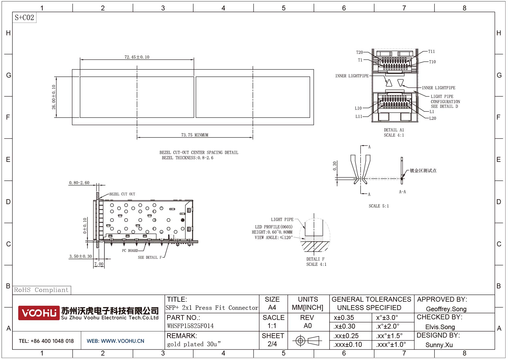 WHSFP15825F014 SFP+ 2×5 10G Press-Fit Cage+Connector Connector Gold Plated30U Fiber Optic cages