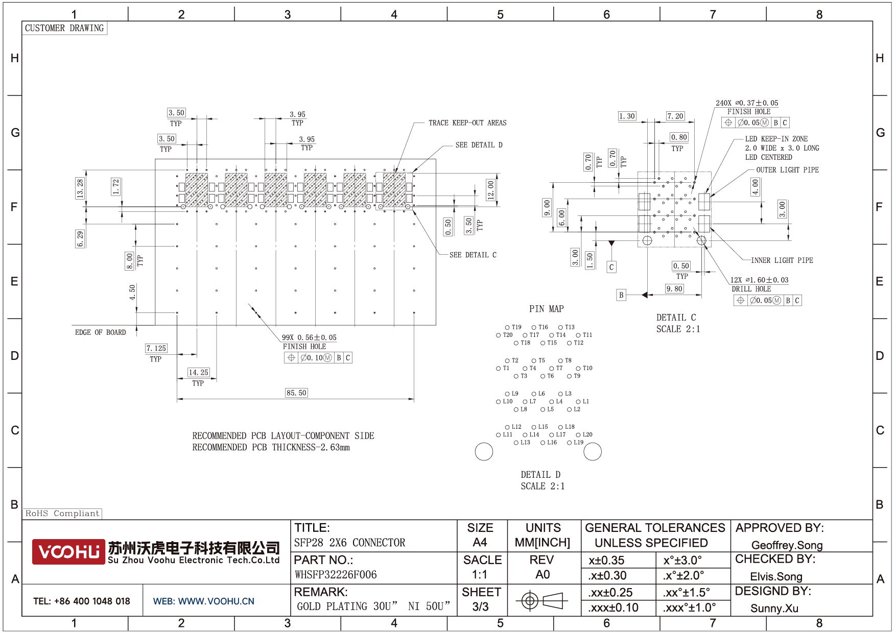 WHSFP15322D002 SFP+ 2×2 10G Press-Fit Cage+Connector Connector Gold Plated15U Fiber Optic cages