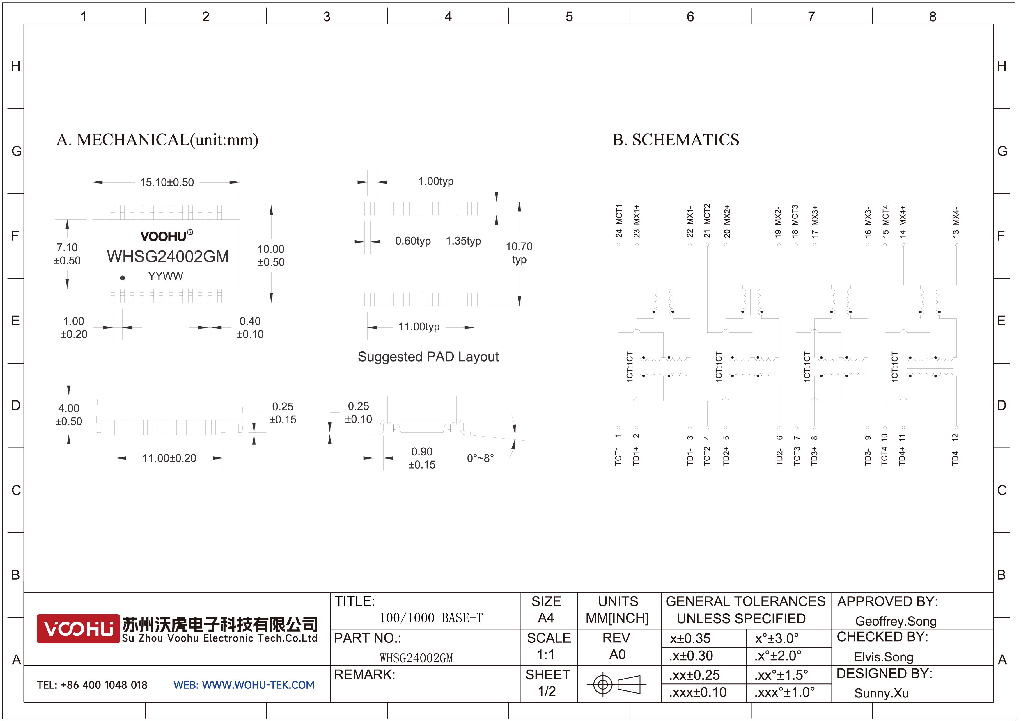 WHSG24002GM Single Port SMD Gigabit Base-T PIN24 non-PoE Lan Transformer