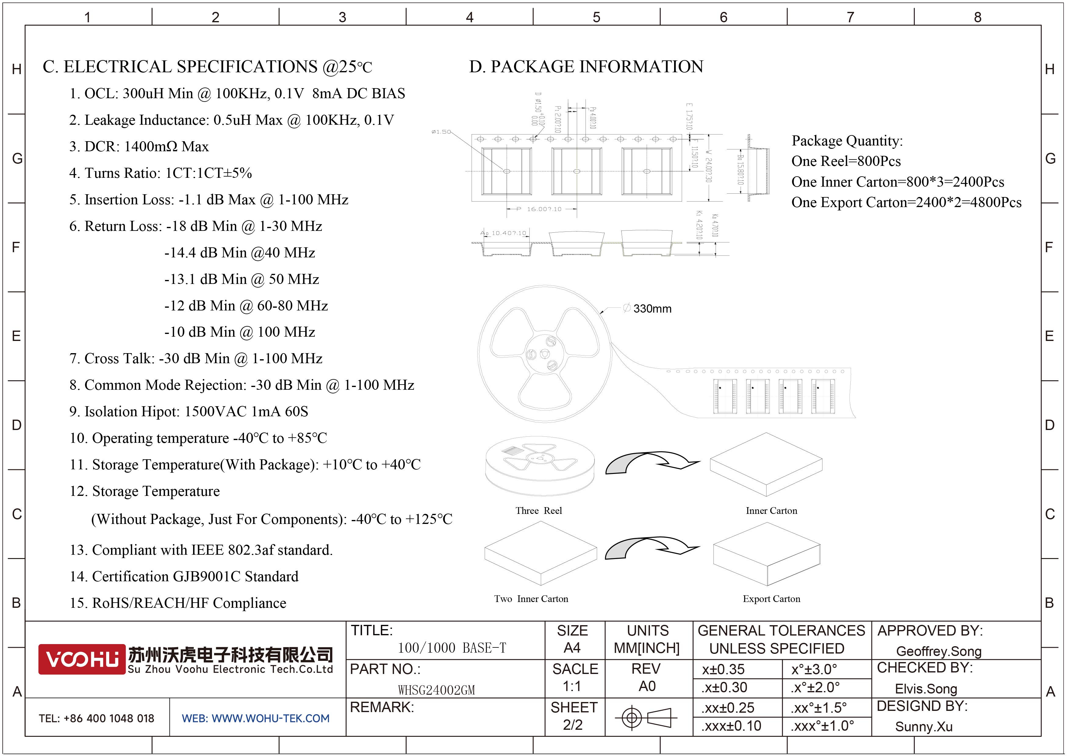 WHSG24002GM Single Port SMD Gigabit Base-T PIN24 non-PoE Lan Transformer
