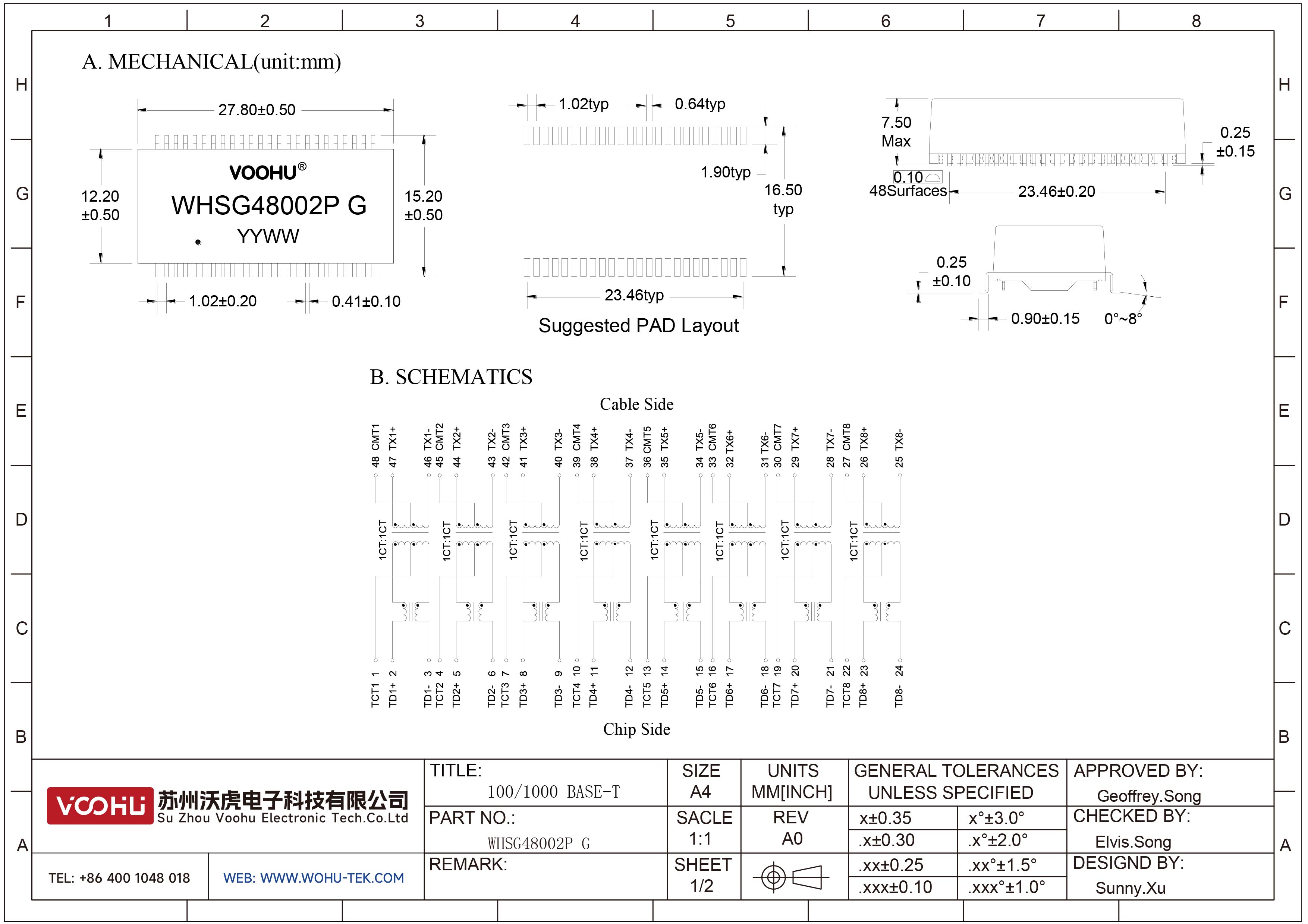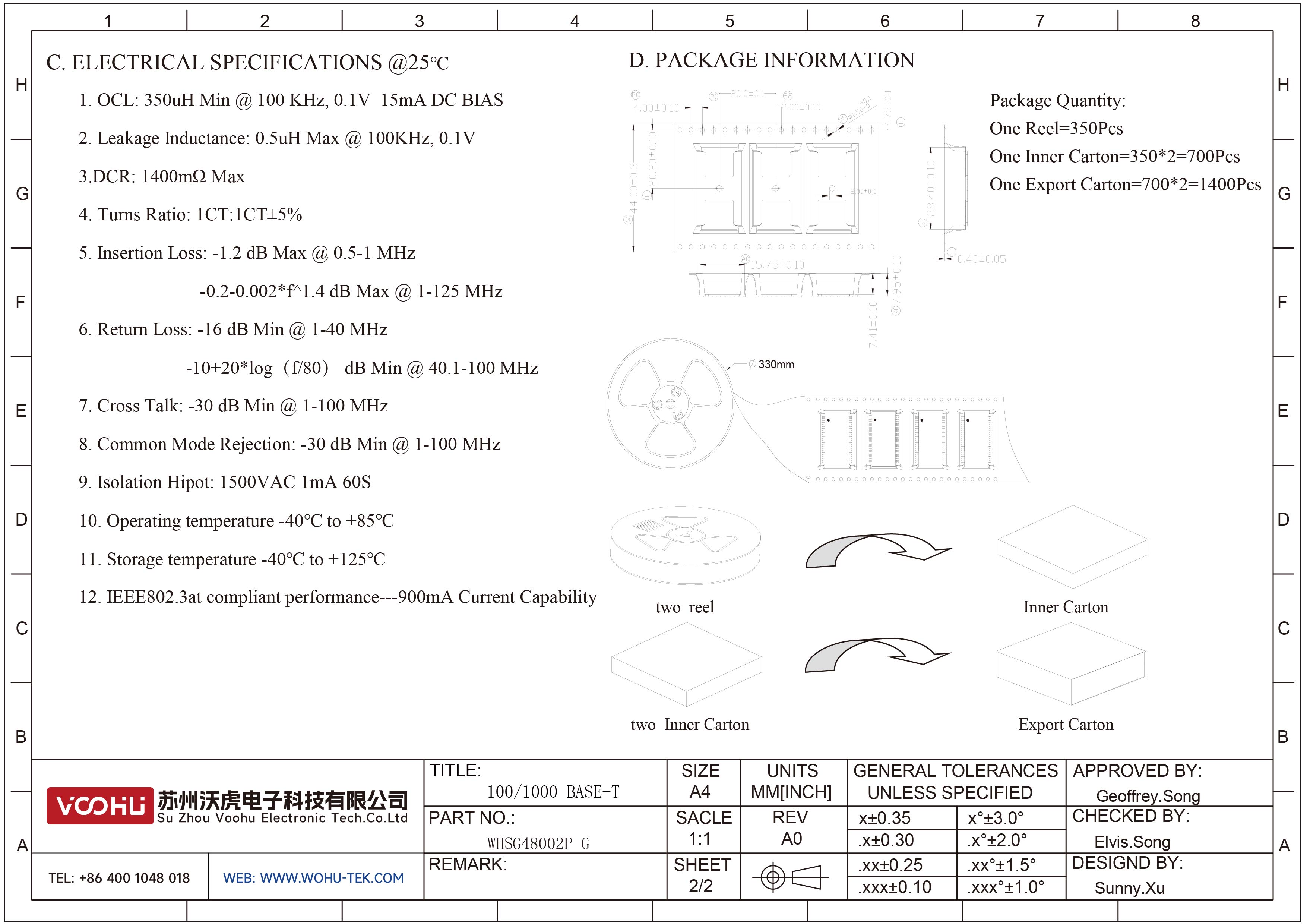 WHSG48002P G Dual Ports SMD Gigabit Base-T PIN48 PoE+ Lan Transformer