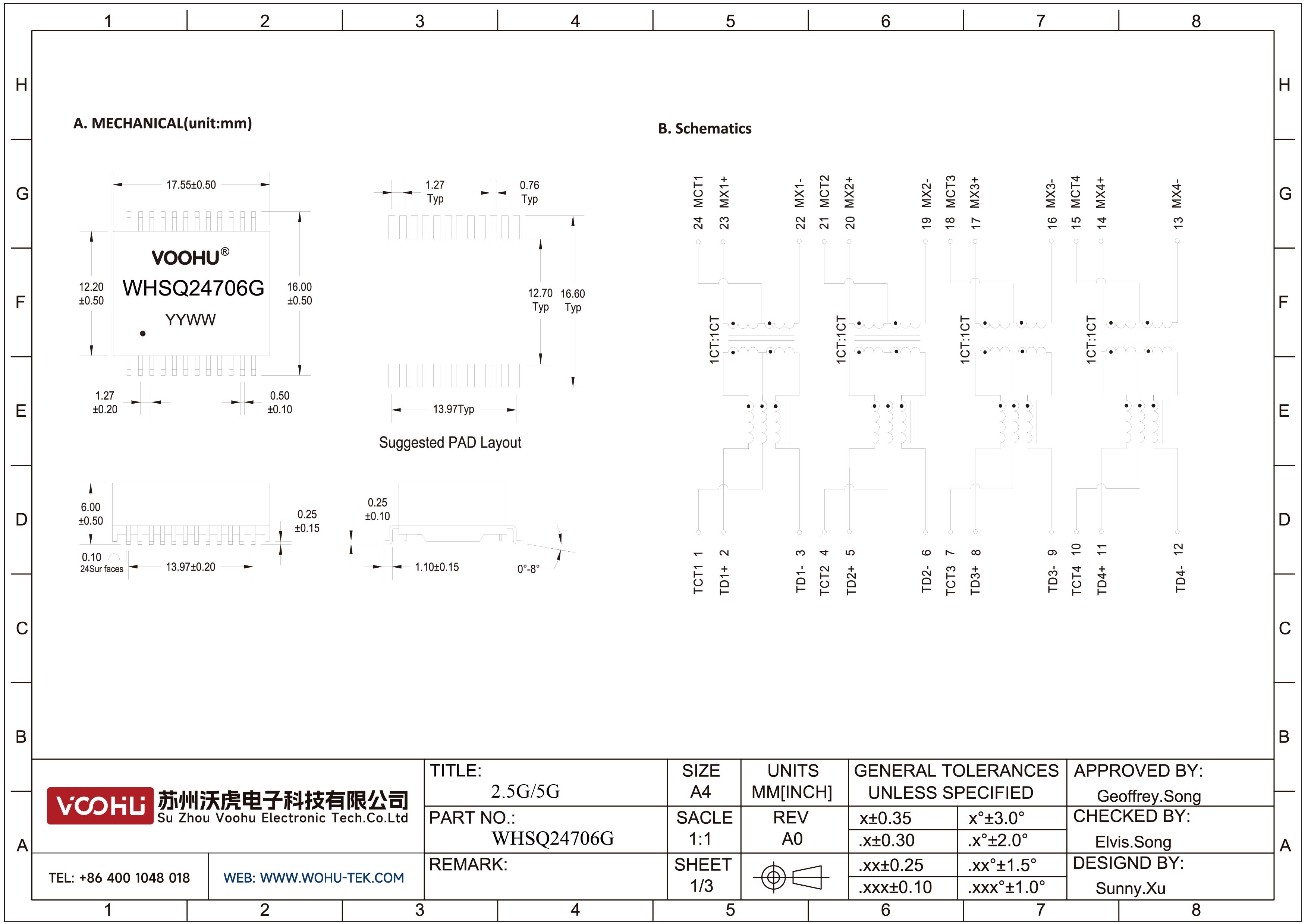 WHSQ24706G Single Port SMD 2.5G/5G PIN24 Lan Transformer