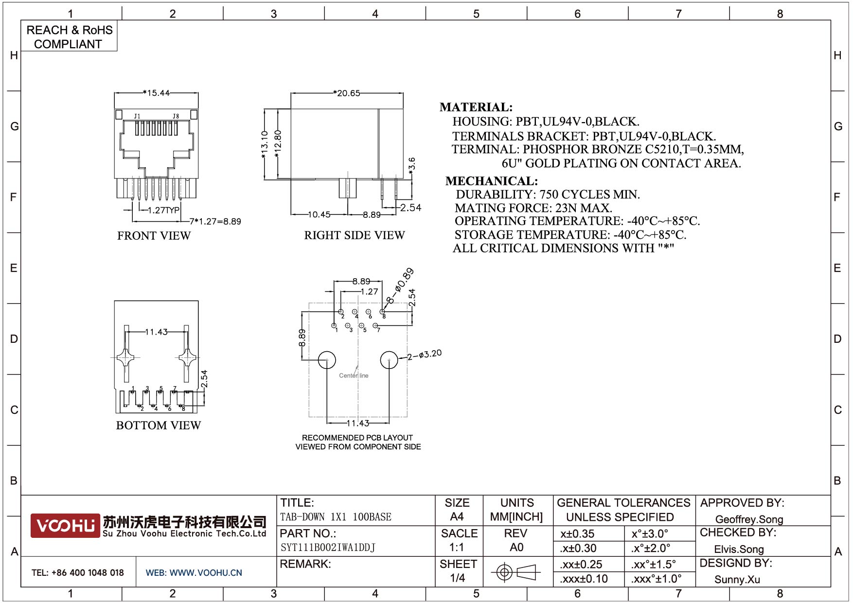 SYT111B002IWA1DDJ 90° side insertion 1*1 Tab Down 10/100M NO LED DIP RJ45