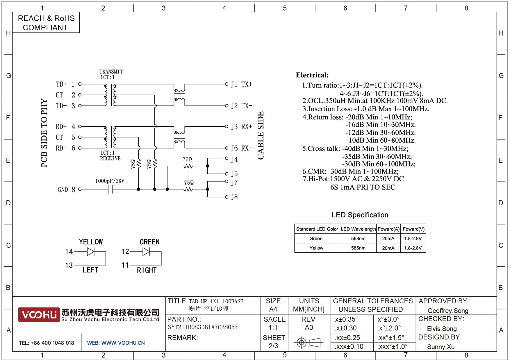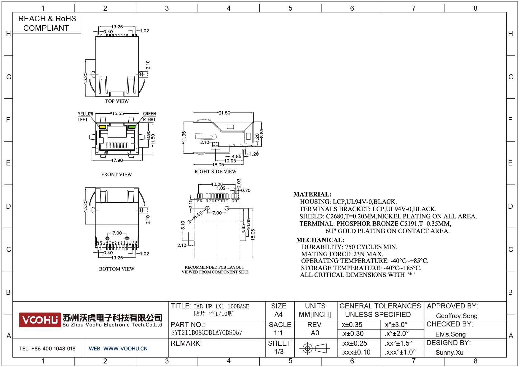SYT211B083DB1A7CBS057 90°侧插 1*1 Tab UP Y/G 10/100M SMT RJ45