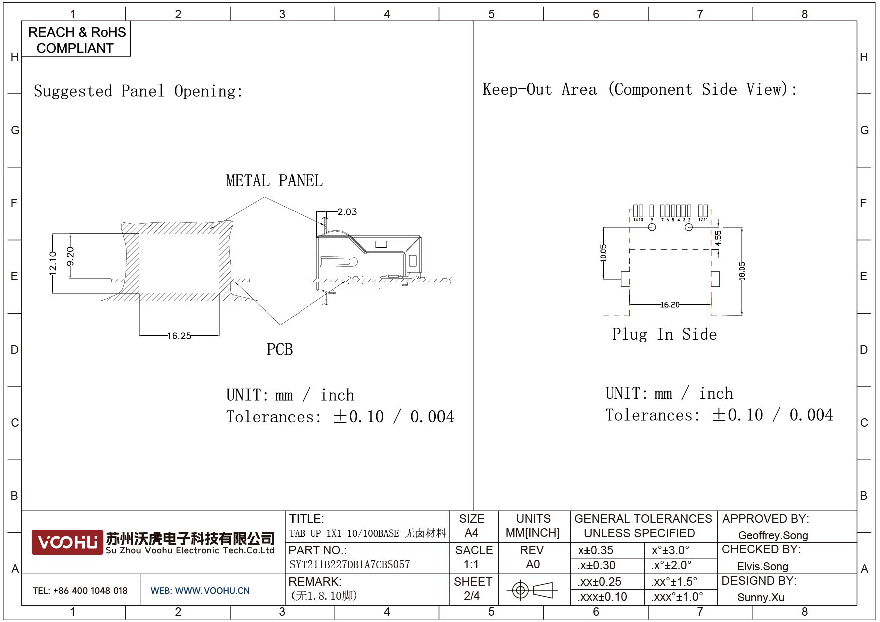 SYT211B227DB1A7CBS057 90° side insertion 1*1 Tab UP Y/G 10/100M SMT RJ45 Offset Connector
