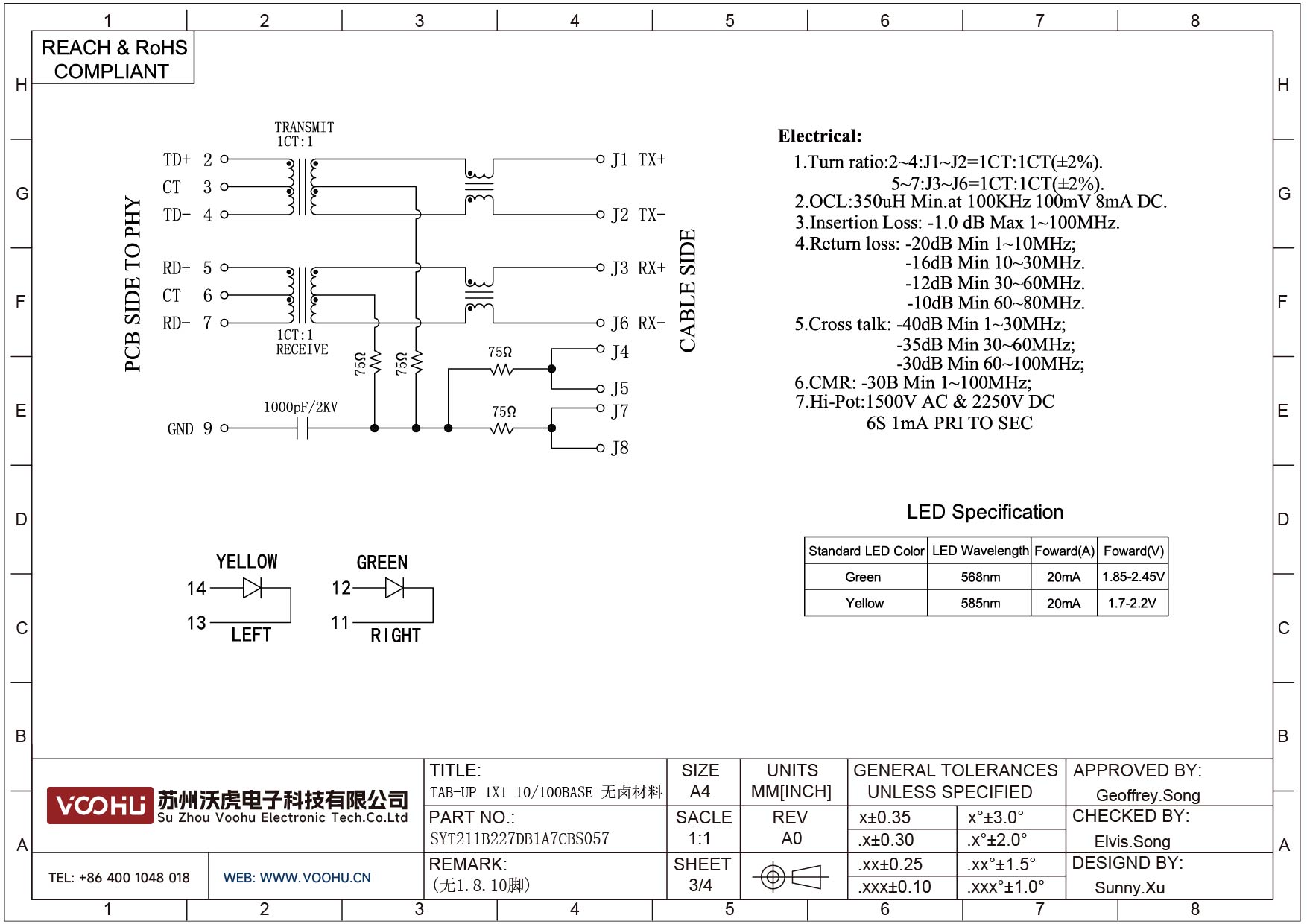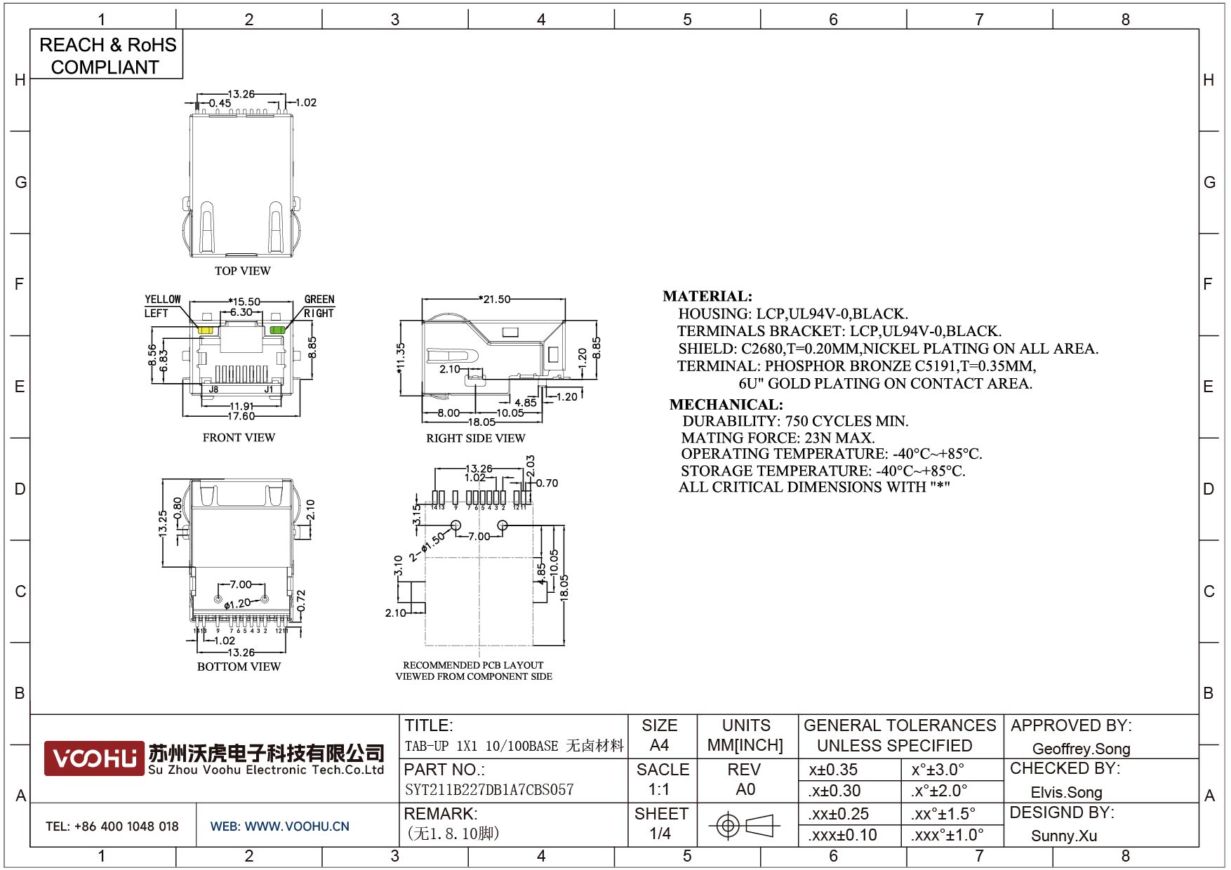 SYT211B227DB1A7CBS057 90°侧插 1*1 Tab UP Y/G 10/100M SMT RJ45 偏置连接器