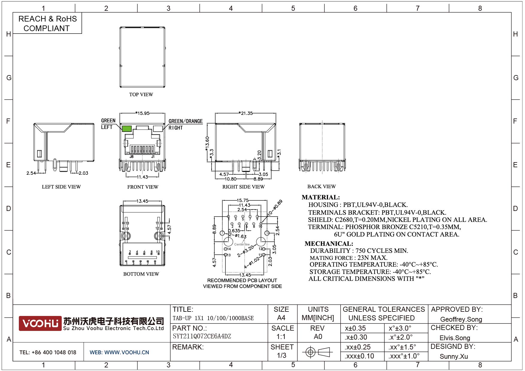 SYT211Q072CE6A4DZ 90° side insertion 1*1 Tab UP 100/1000M LED G/GO DIP RJ45