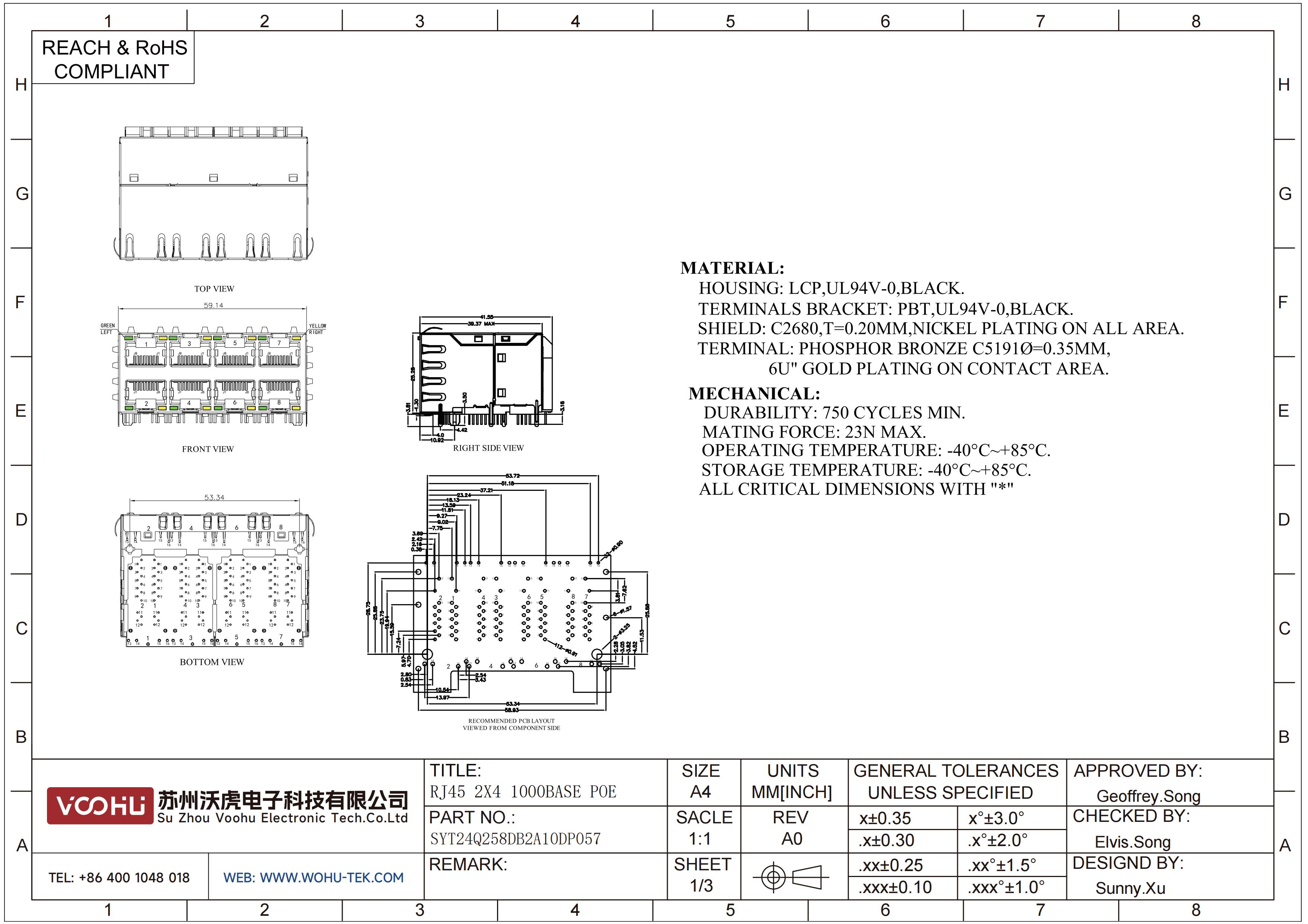 SYT24Q258DB2A10DP057 90° 2*4 Tab-上/下 100/1000BASE POE 600mA LED G/Y DIP RJ45