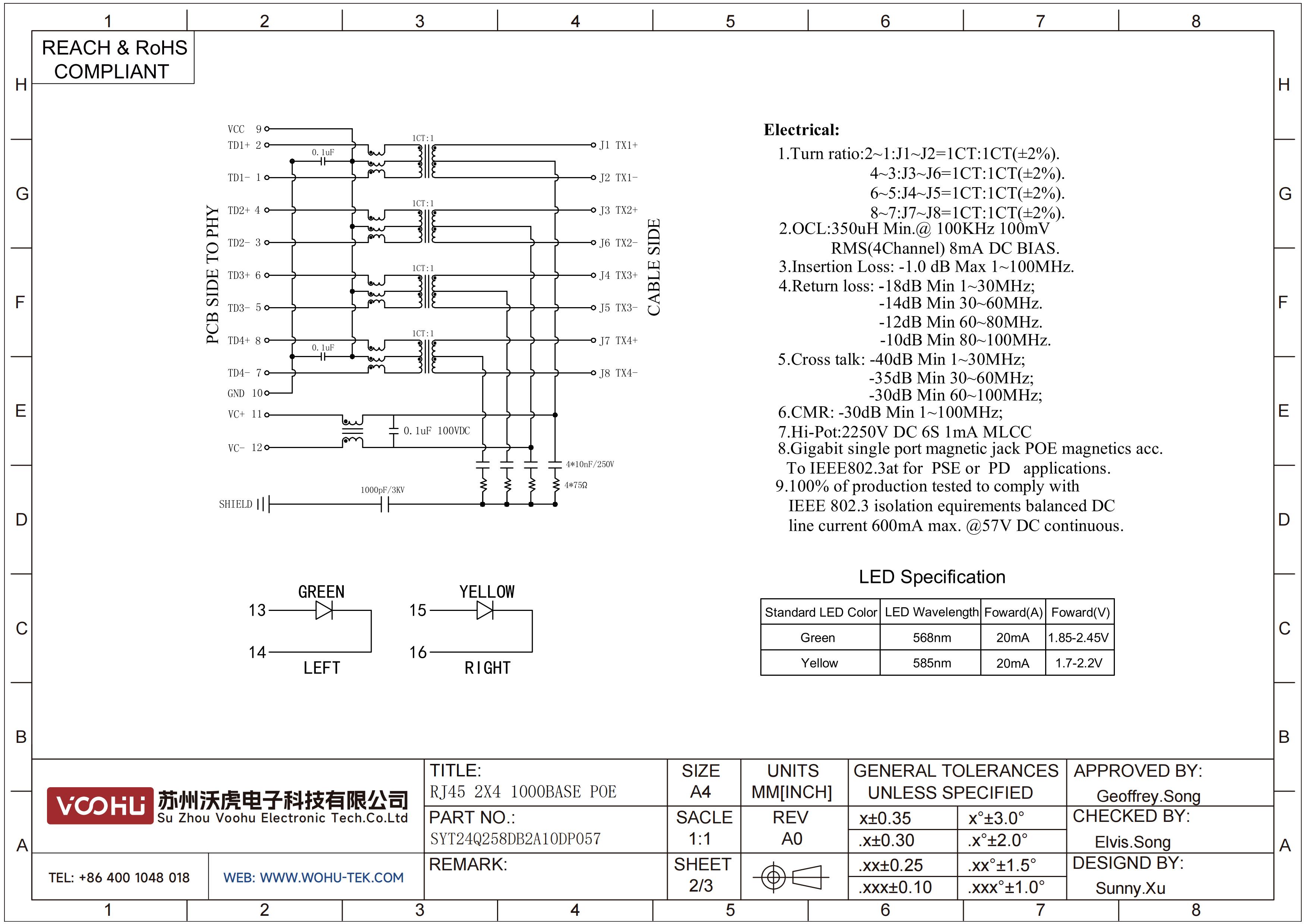 SYT24Q258DB2A10DP057 90° 2*4 Tab-Up/Down 100/1000BASE POE 600mA LED G/Y DIP RJ45