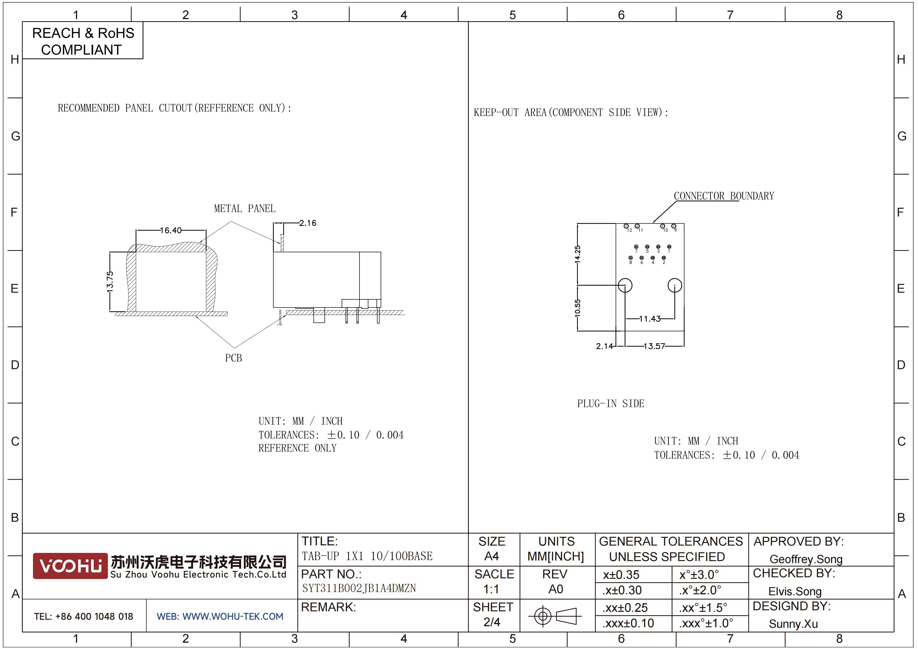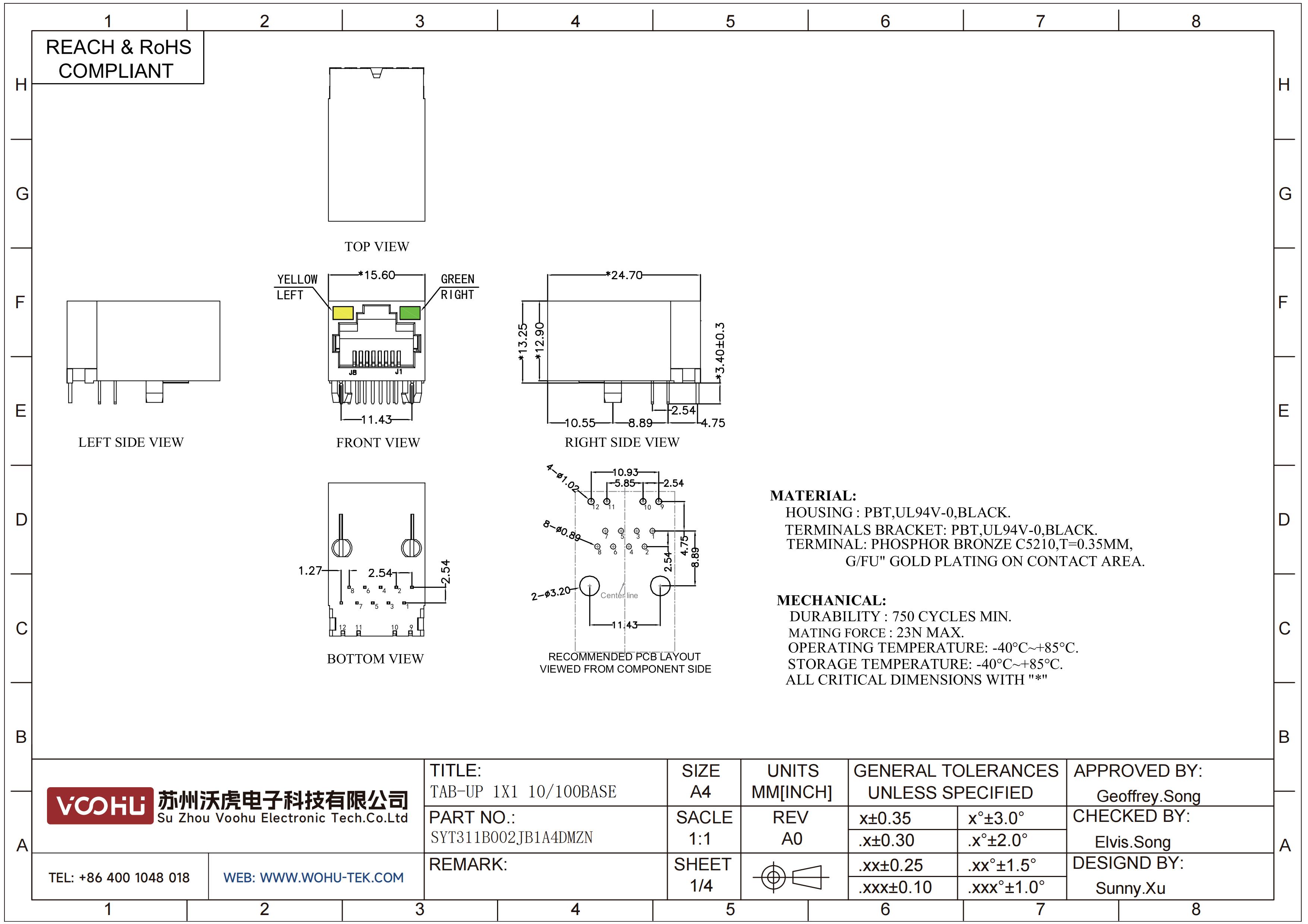 SYT311B002JB1A4DMZN 90° side insertion 1*1 Tab UP Y/G 10/100M DIP RJ45