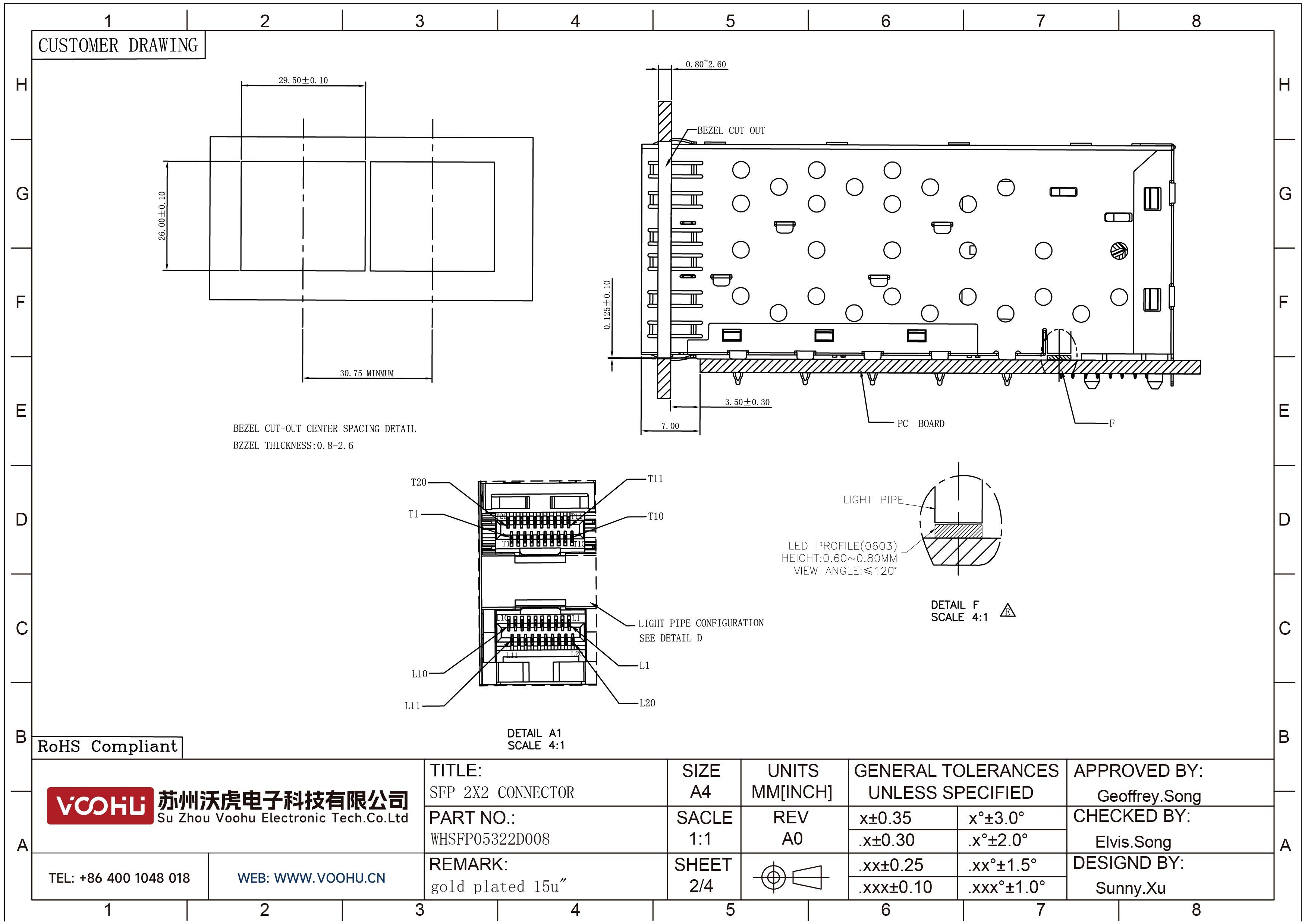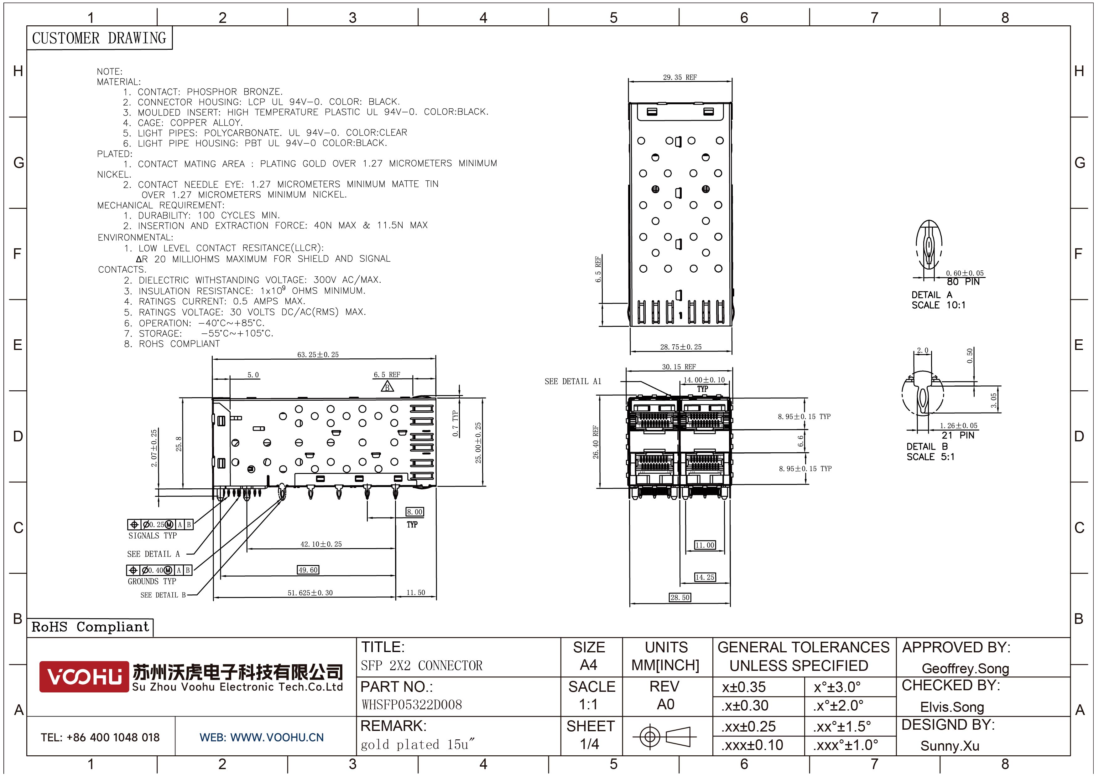 WHSFP05322D008 SFP 2×2 5G 笼+连接器 连接器 镀金15U 光纤笼