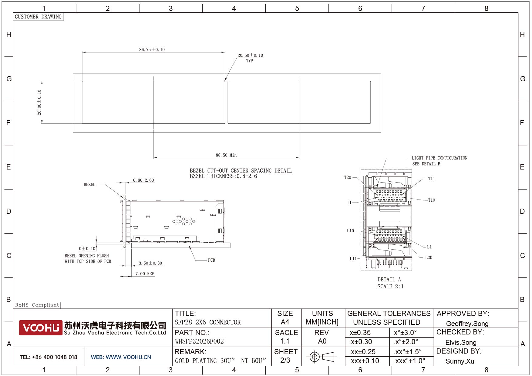 WHSFP15926F008 SFP+ 2×6 10G Press-Fit Cage+Connector Connector Gold Plated30U Ni 30U Fiber Optic cages
