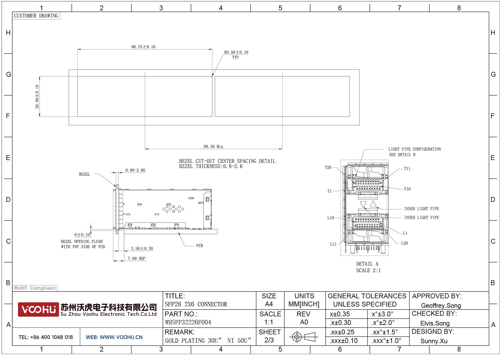 WHSFP16228F028 SFP+ 2×8 10G Press-Fit Cage+Connector Connector Gold Plated30U Ni 30U Fiber Optic cages