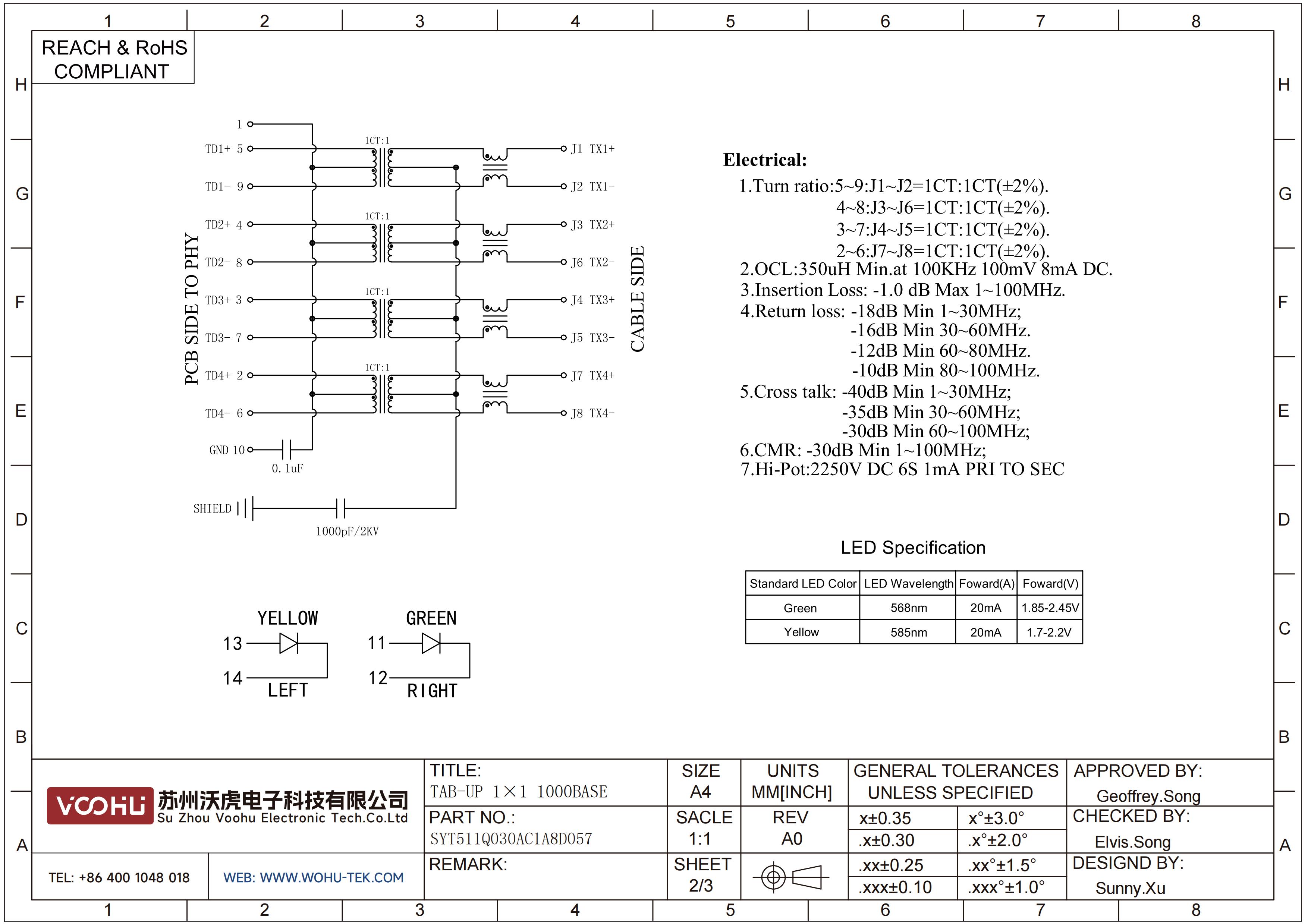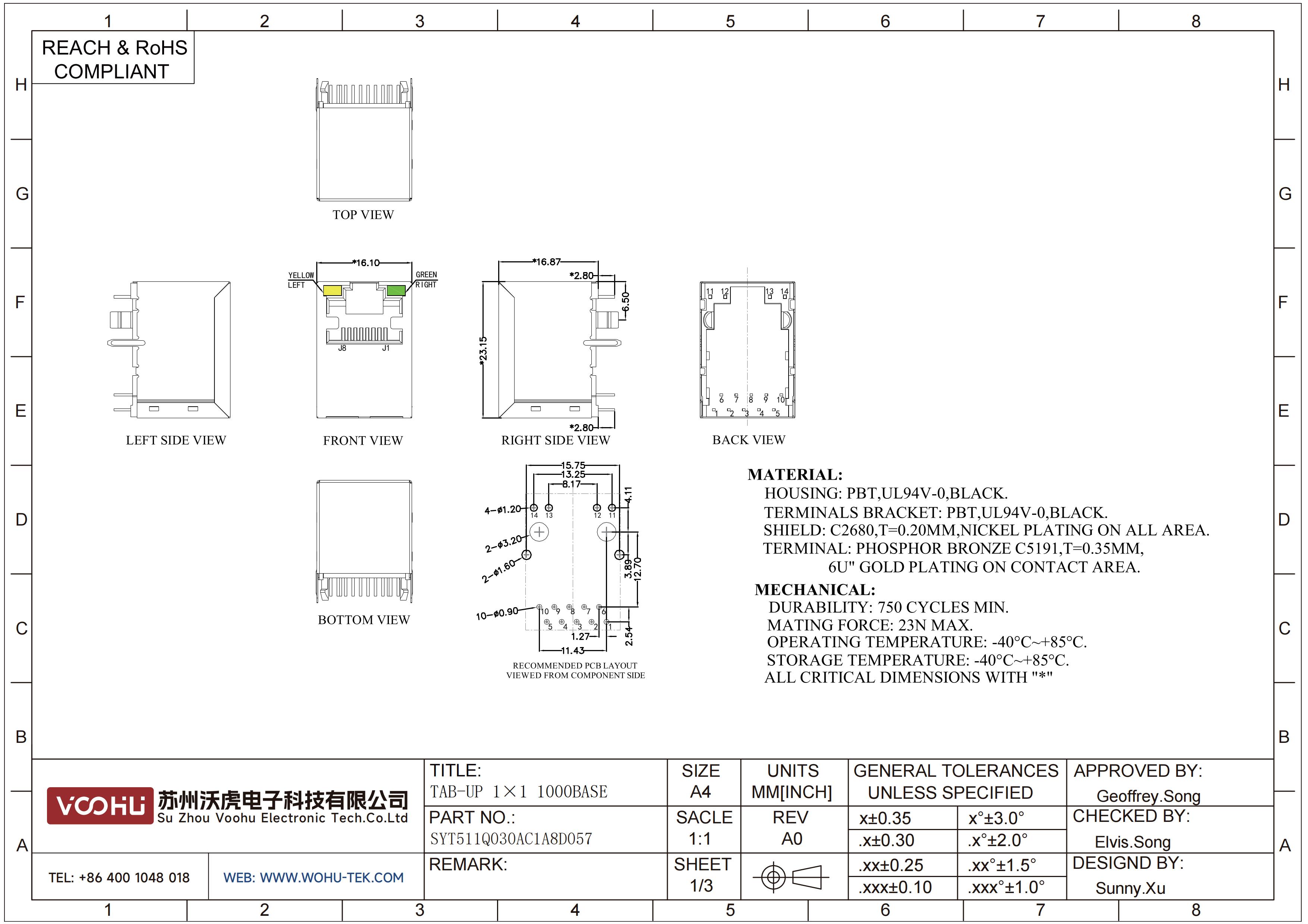 SYT511Q030AC1A8D057 180° 1*1 Tab-Up 100/1000BASE LED Y/G DIP RJ45