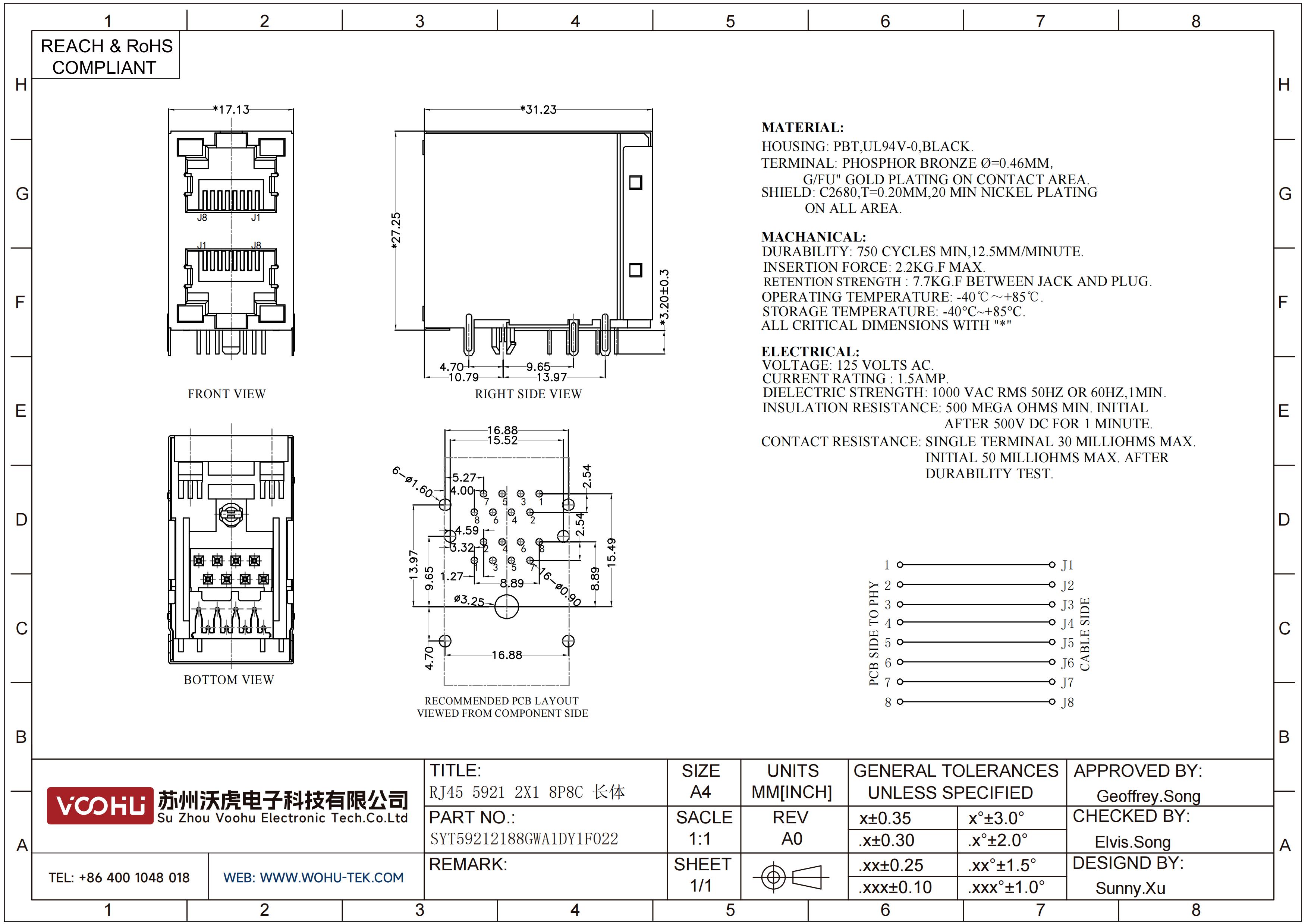 SYT59212188GWA1DY1F022 90°侧插入8P8C 2*1 TAB上/下LED GY/GY SHIELD TABS DIP RJ45
