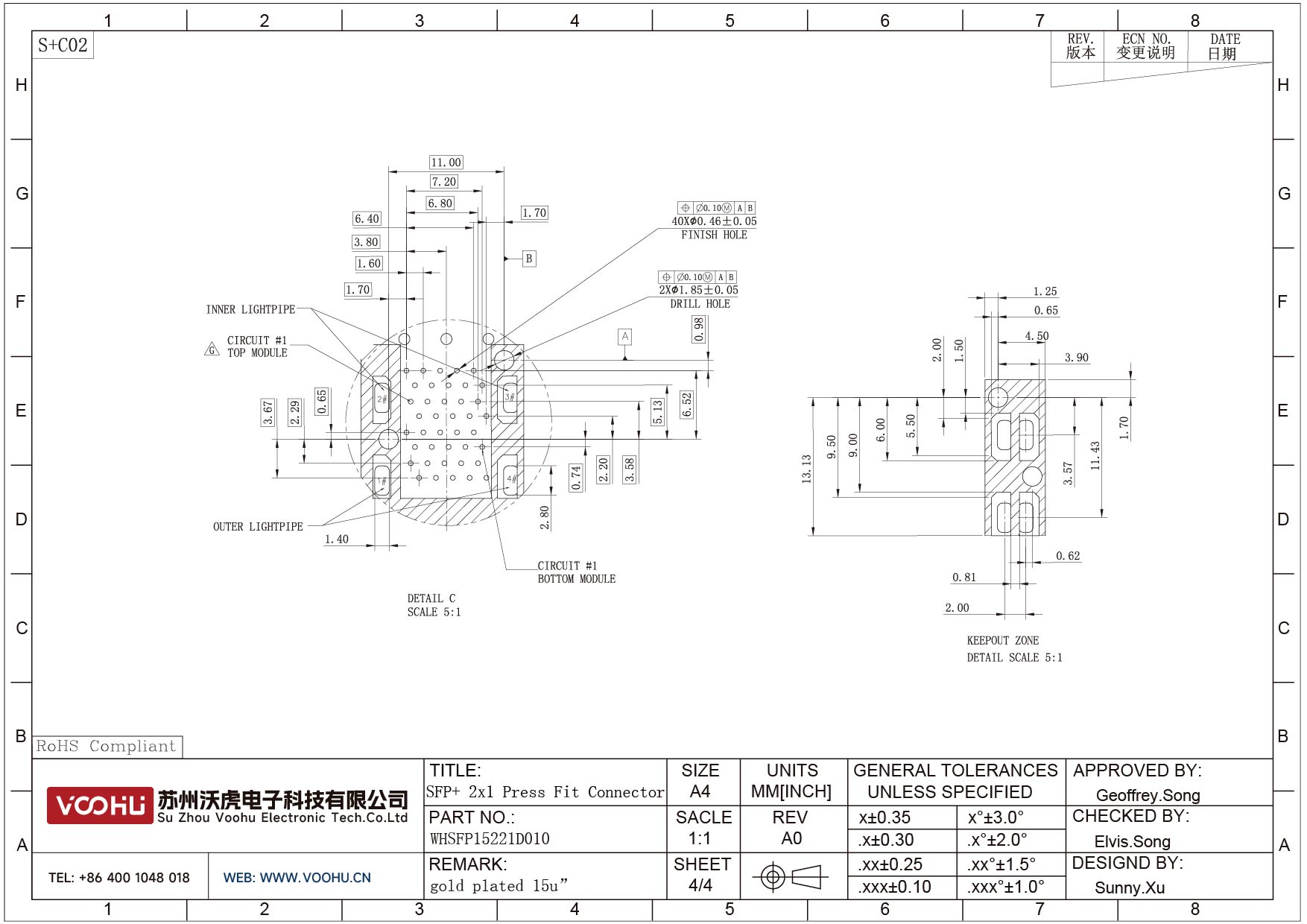WHSFP15221D010 SFP+ 2×1 10G Press-Fit Cage+Connector Connector Gold Plated15U Fiber Optic cages