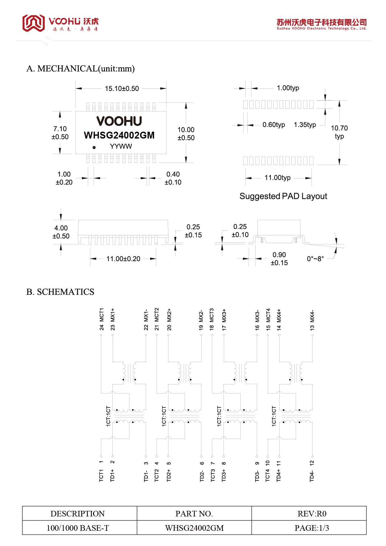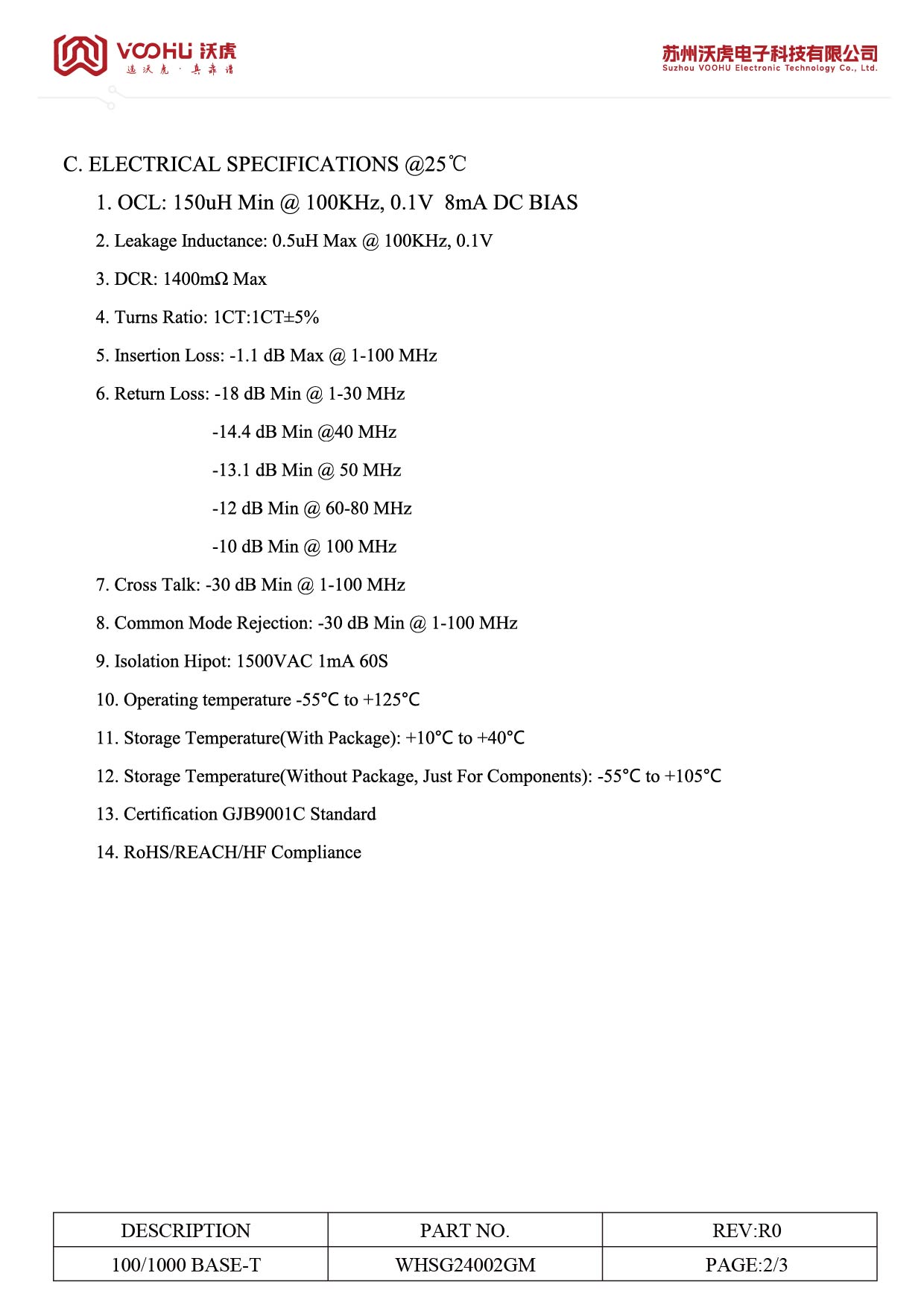 WHSG24002GM 单端口 SMD 千兆底座-T PIN24 非-PoE LAN 变压器